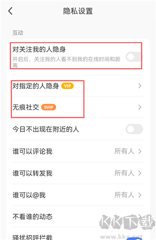 3、开启【对关注我的人隐身】即可成为隐身状态,大家也可以开启vip或svip对指定的人隐身或无痕社交。