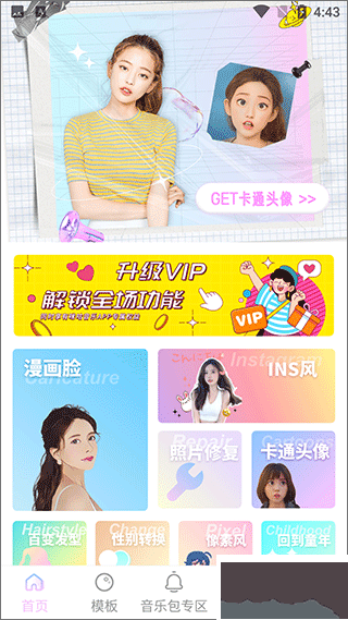 1、进入首页,可以看到漫画脸、INS风、照片修复、卡通头像等很多种修图选项;