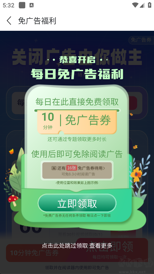 2、进入后即可看到免广告福利,点击【立即领取】后即可生效。