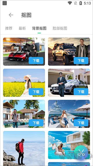 2、选择抠图,进去该功能以后,我们可以选择推荐、最新、背景抠图以及脸部抠图内容,一键下载;