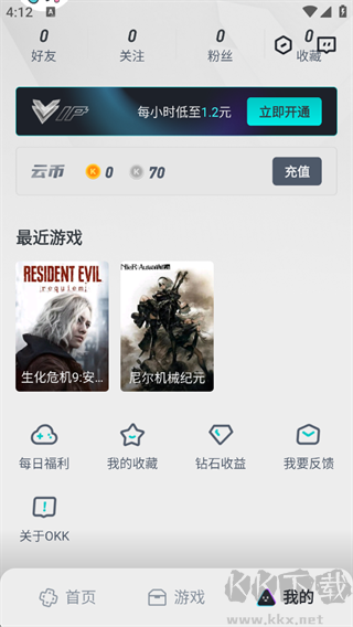 OKK云电脑app是一款电竞级云游戏软件,搭载RTX4070显卡,低延迟、不卡顿、不掉帧,让手机秒变高配游戏主机。内置免费Steam加速器,支持极限竞速:地平线5、漫威蜘蛛侠2、生化危机4重制版、荒野大镖客2、NBA2K26等多款3A大作。可以自定义游戏键位,兼容手柄等外设,操作更顺手。云端存档实时同步,换设备也能无缝续玩,随时随地畅享主机级游戏体验。需要的朋友快来下载试试吧!