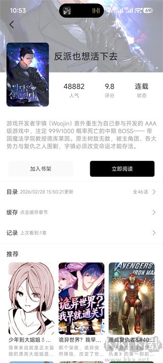 点击任意漫画封面,进入作品详情页,可查看人气值、评分、连载状态、完整剧情简介,还能点击「加入书架」或「立即阅读」。