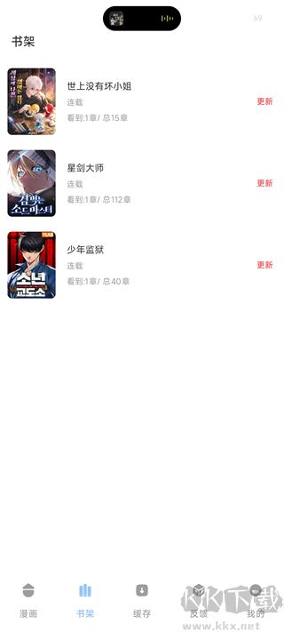 点击底部「书架」进入书架页,可查看已收藏的漫画,直观看到每部作品的连载状态和自己的阅读进度,方便后续追更。