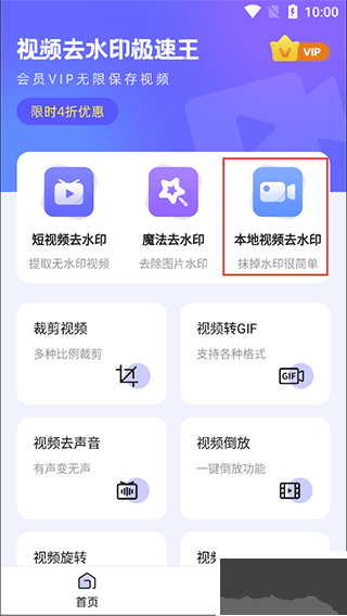 第一步、打开【视频去水印极速王】,进入【首页】,点击进入【本地视频去水印】功能模块;
