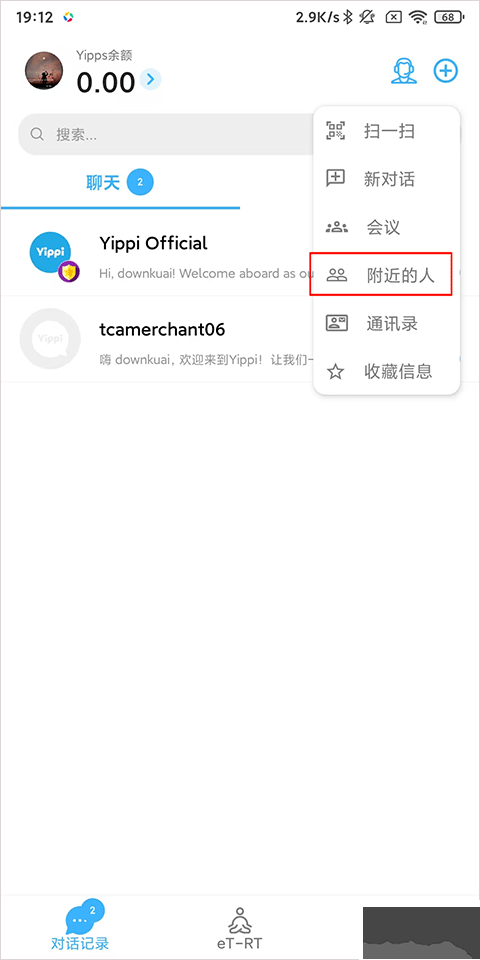 1、打开Yippi,点击右上角的“+”按钮,在弹出的列表中选择附近的人。