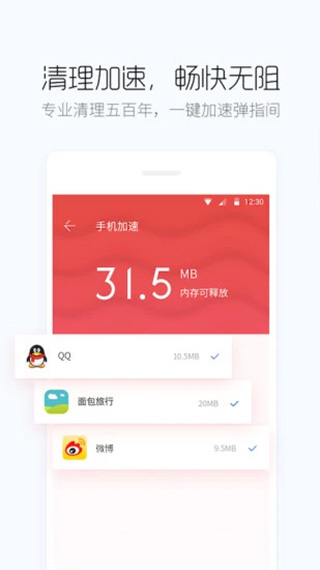 由百度推出的手机安全app,用户在app上面可以免费进行系统优化,垃圾清理,手机上网流量保护,骚扰电话拦截等等功能,它是让用户尊享轻巧、智能、快速、纯净的产品体验的软件!