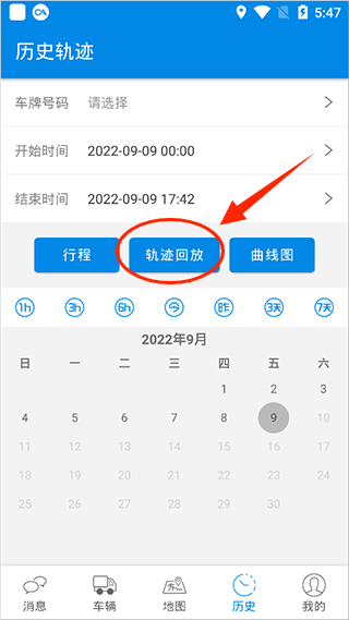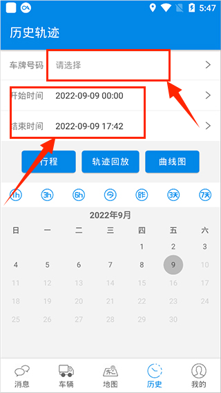 2、在上方输入车牌号码并在下方选择轨迹的时间范围。
