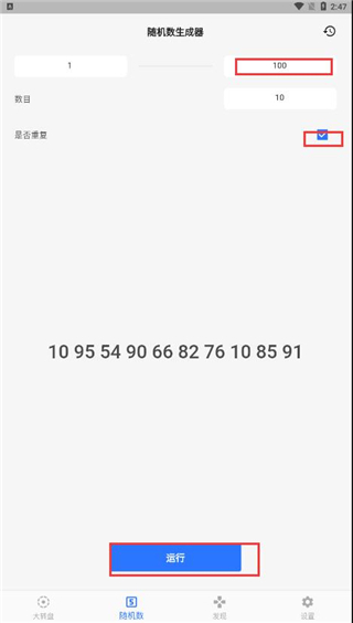 4、在随机数中,可以设置数目,并且支持设置是否重复,点击运行即可开始。