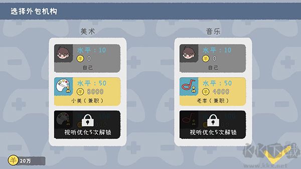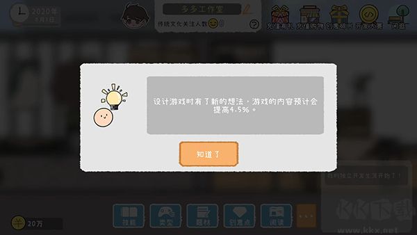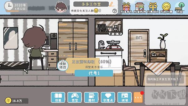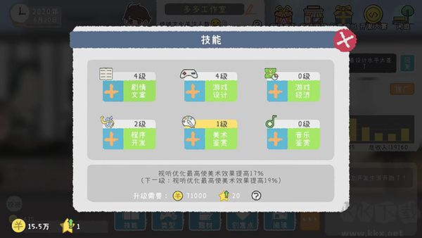 12、还能通过对【技能】中的剧情文案、游戏设计、游戏经济、程序开发、美术鉴赏、音乐鉴赏各项技能进行升级来提高游戏分数,