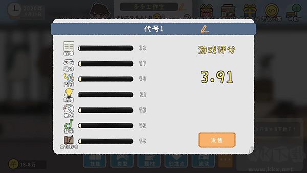 10、等测试修改完成后可看到故事、趣味、内容、新意、美术、音乐、文化影响的分数以及最终的评分,选择【发售】选项即可开始发布游戏,