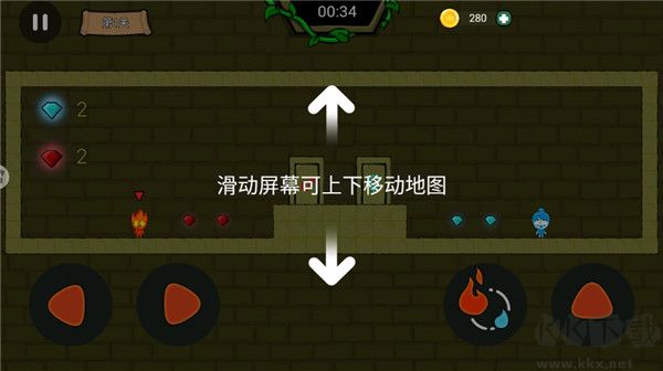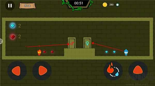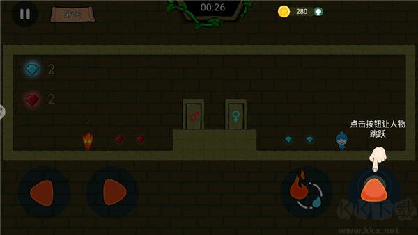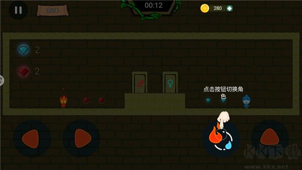 4、当需要切换人物角色时,点击屏幕上代表火和水的图标,即可实现公主与王子角色的切换。