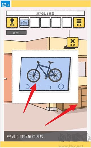 2、在游戏界面桌子上找到照片、可获得自行车道具,为后续铺垫。