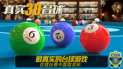 2、挑战网络上来自全世界的朋友在3D台球世界对战,从草根轻松成长为台球明星