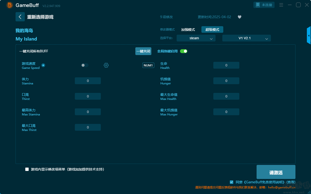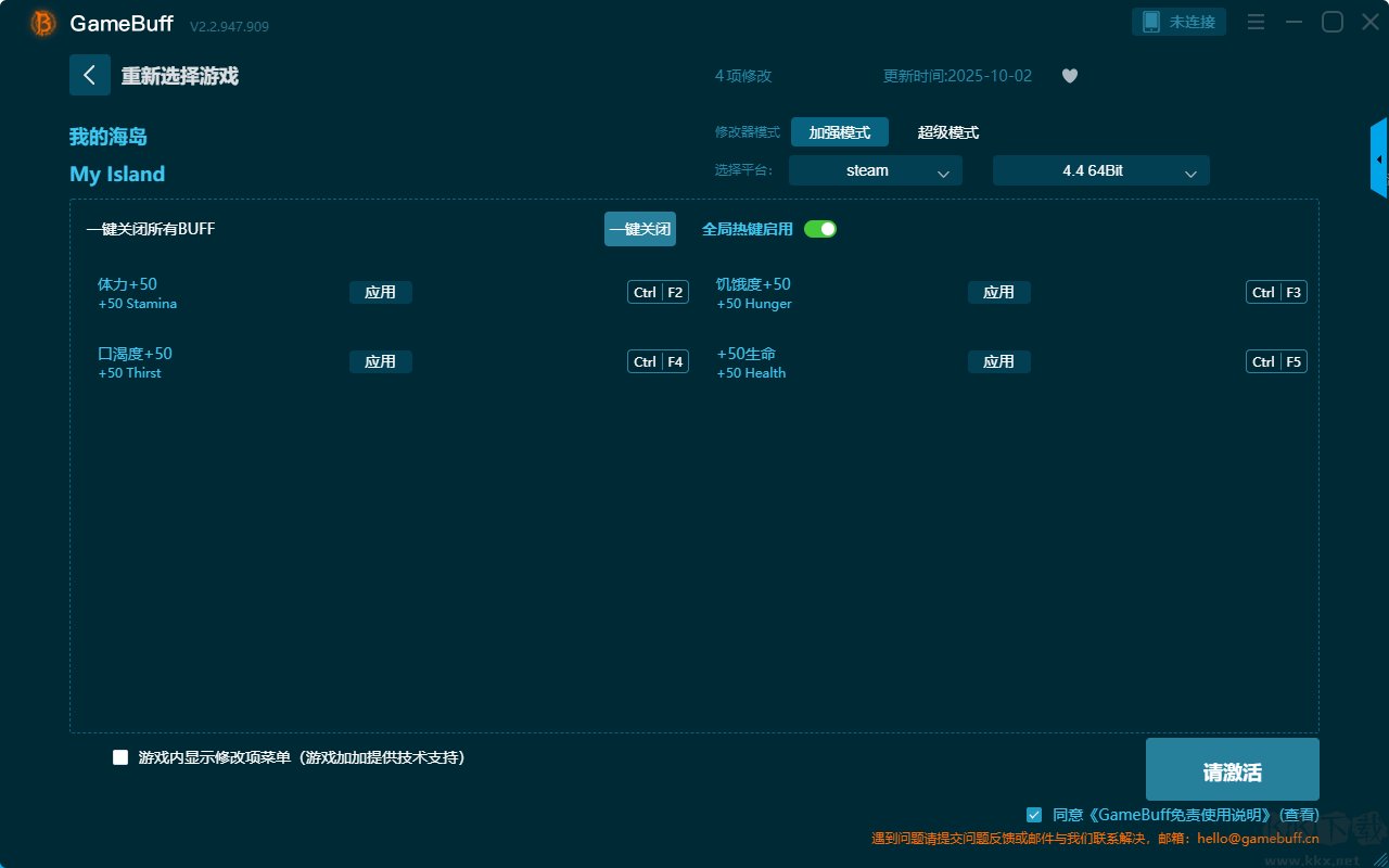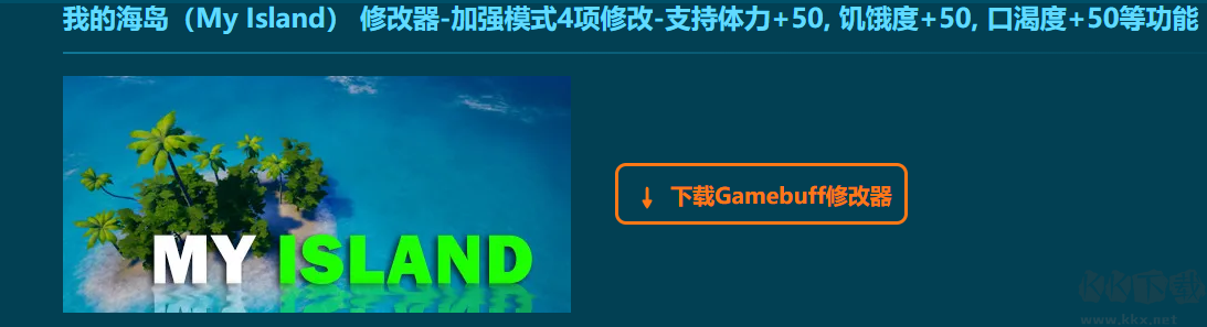 我的海岛(My Island)4项修改器pc中文版是一款可以为游戏我的海岛(My Island)进行修改辅助的游戏修改器。玩家可以在加强模式和超级模式中自由选择,不同模式的部分功能不同。支持在游玩过程中开启体力 +50、口渴度 +50、饥饿度 +50、+50 生命四项加强模式修改。需要的小伙伴快来KK下载站下载游玩体验吧。