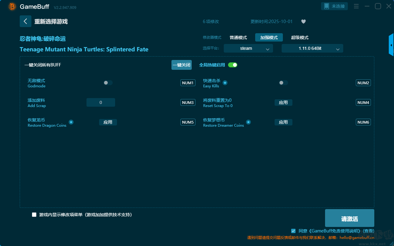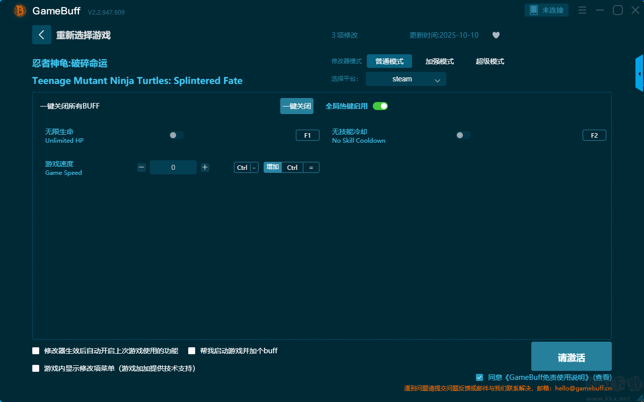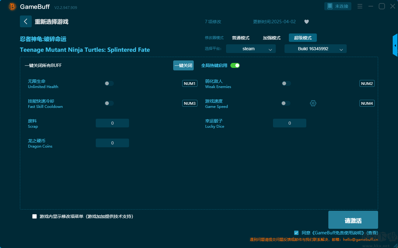 忍者神龟破碎命运三项修改器pc官方版是一款使用且功能强大的游戏辅助修改器。玩家可在游玩过程中在普通、加强、超级等三个模式中选择启动,其中超级模式支持为游戏开启无限生命、技能快速冷却、弱化敌人、幸运骰子、废料、龙之硬币、游戏速度七项强大功能。喜欢的小伙伴快来KK下载站下载体验吧。