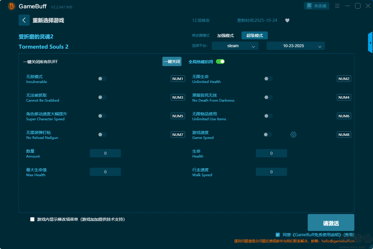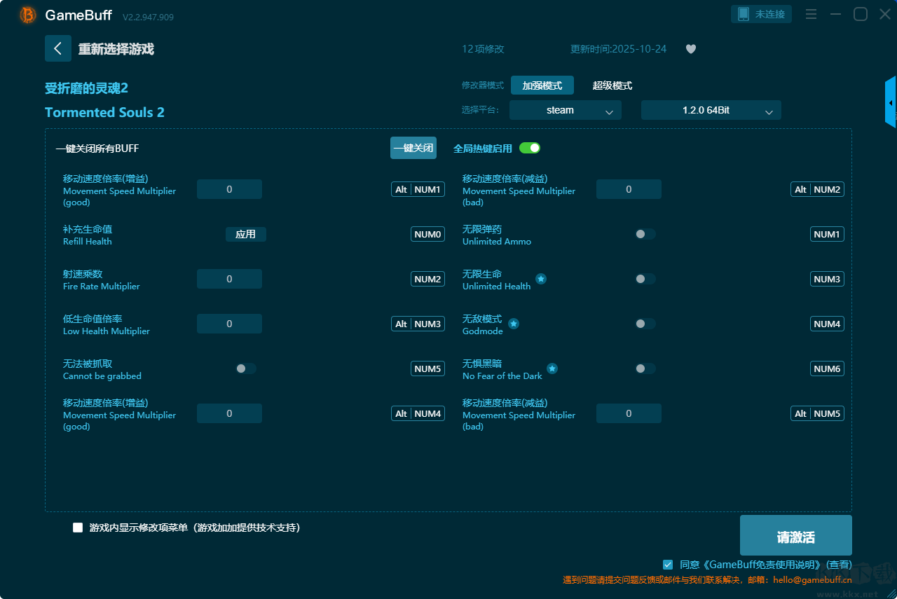 受折磨的灵魂2十二项修改器pc中文版是一款可为游戏受折磨的灵魂2进行游戏辅助修改的游戏工具。玩家可在游戏过程中一键开启,移动速度倍率 (增益)、移动速度倍率 (减益)、补充生命值、射速乘数、低生命值倍率、无法被抓取、移动速度倍率(增益)等十二项加强模式修改功能。需要的小伙伴快来KK下载站下载这款强大的修改器体验使用一下吧。