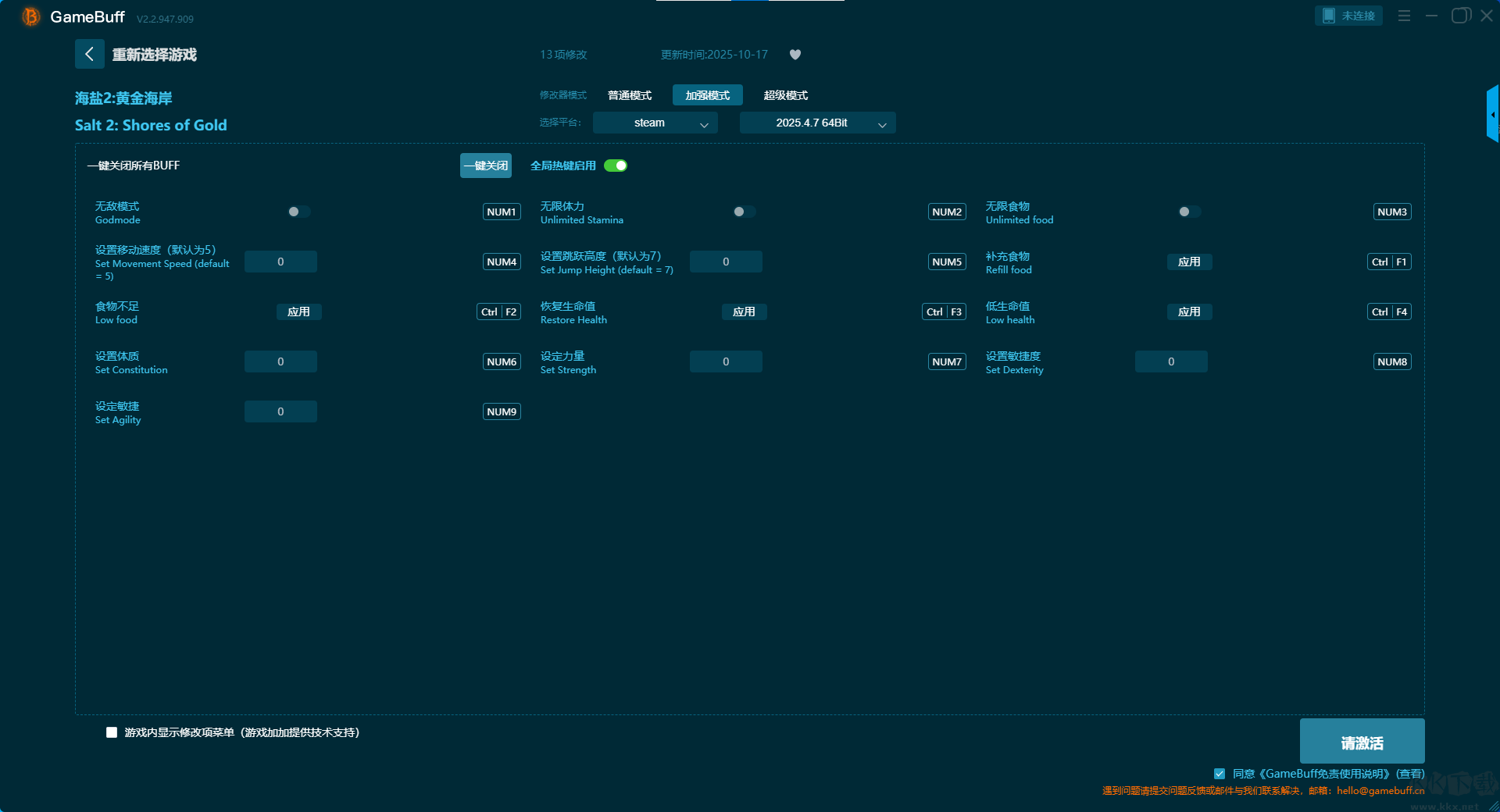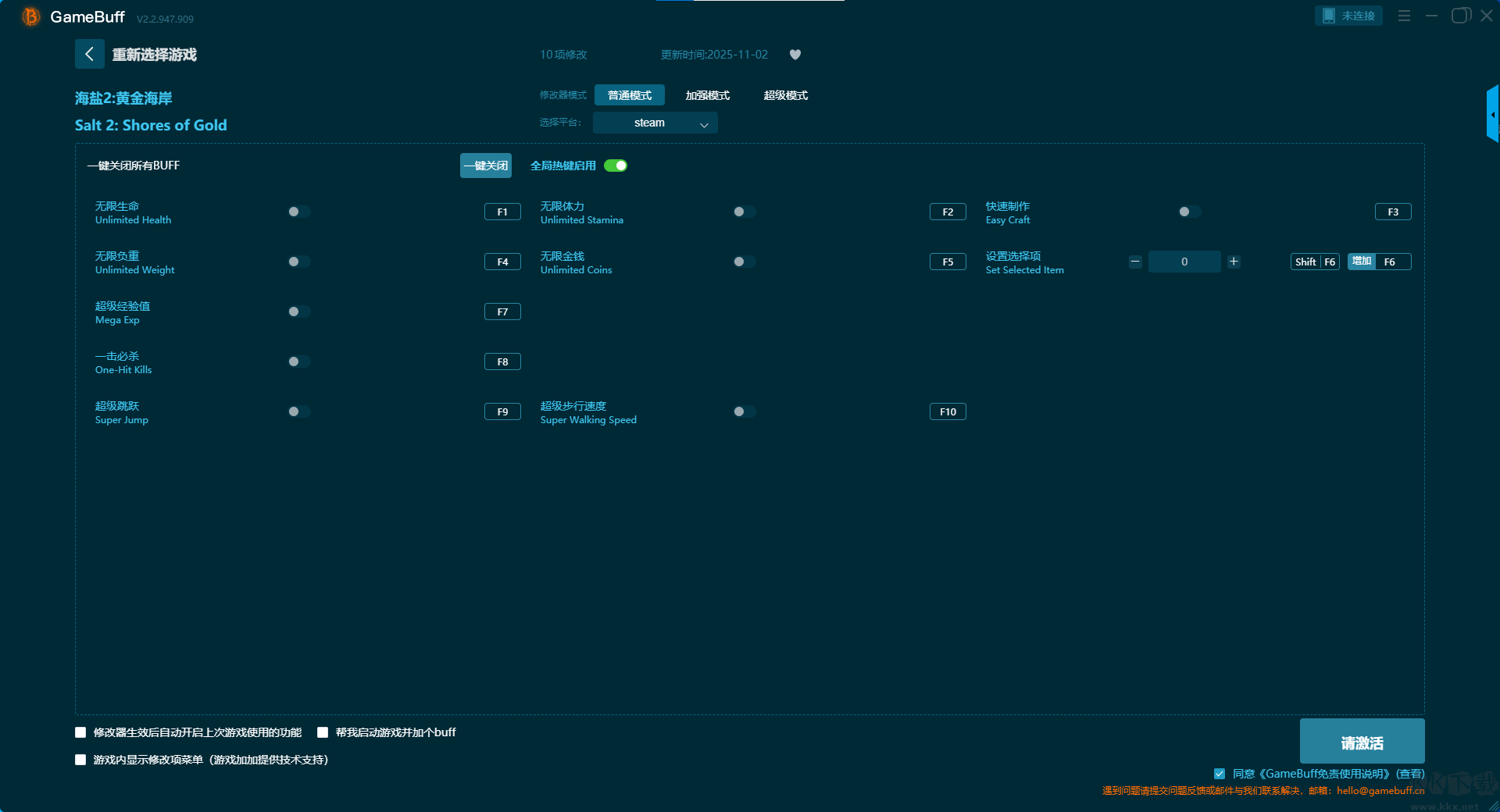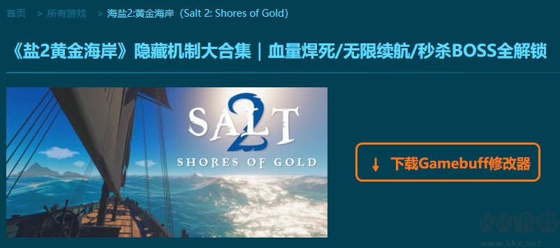 盐2黄金海岸十项修改器pc绿色版是一款功能强大且实用的游戏辅助器。你可以在游戏盐2黄金海岸中一键开启,无限生命、无限体力、无限负重、快速制作、超级经验值、无限金钱、一击必杀等10项普通模式修改功能,还支持steam平台使用。喜欢的小伙伴快来KK下载站下载这款修改器体验使用吧。