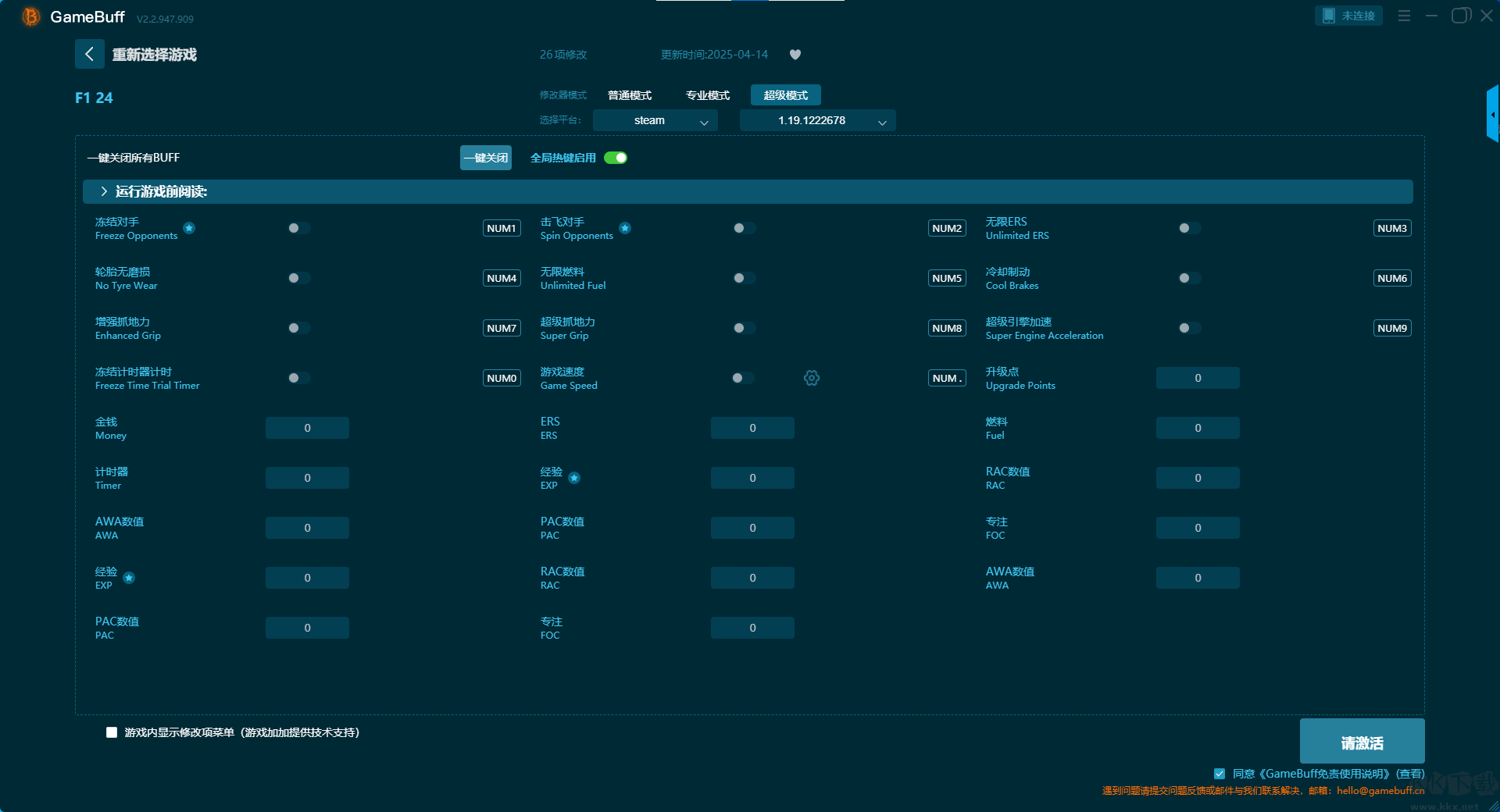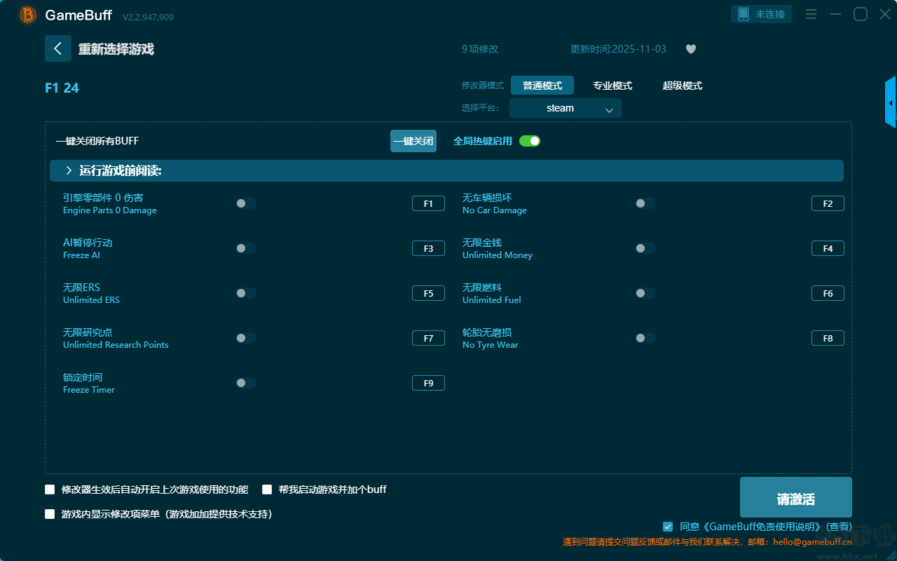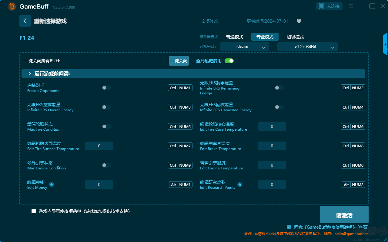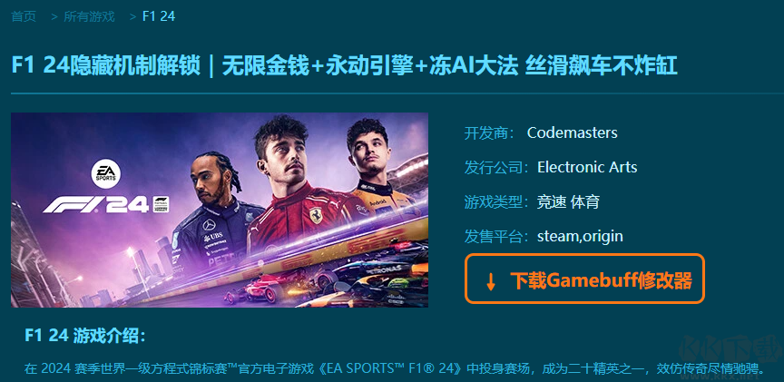F1 24九项修改器pc免费版是一款功能强大的游戏辅助工具。这款修改器的功能非常的强大,你可以在多项修改模式中选择一项开启使用,可以一键开启,引擎零部件 0 伤害、AI 暂停行动、无限 ERS、无限研究点、锁定时间、无车辆损坏、无限金钱等九项普通模式修改功能。喜欢的小伙伴快来KK下载站下载体验吧。