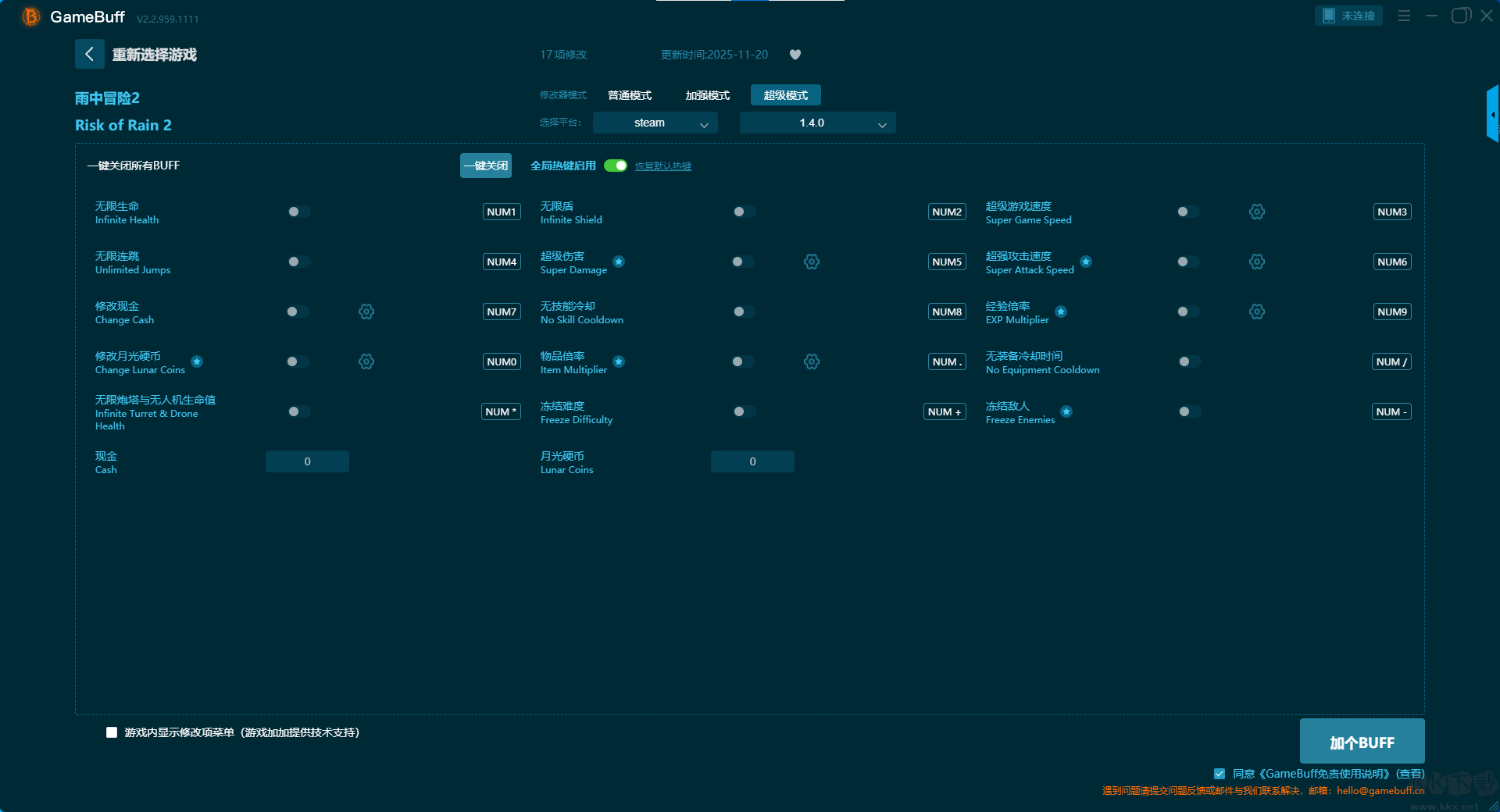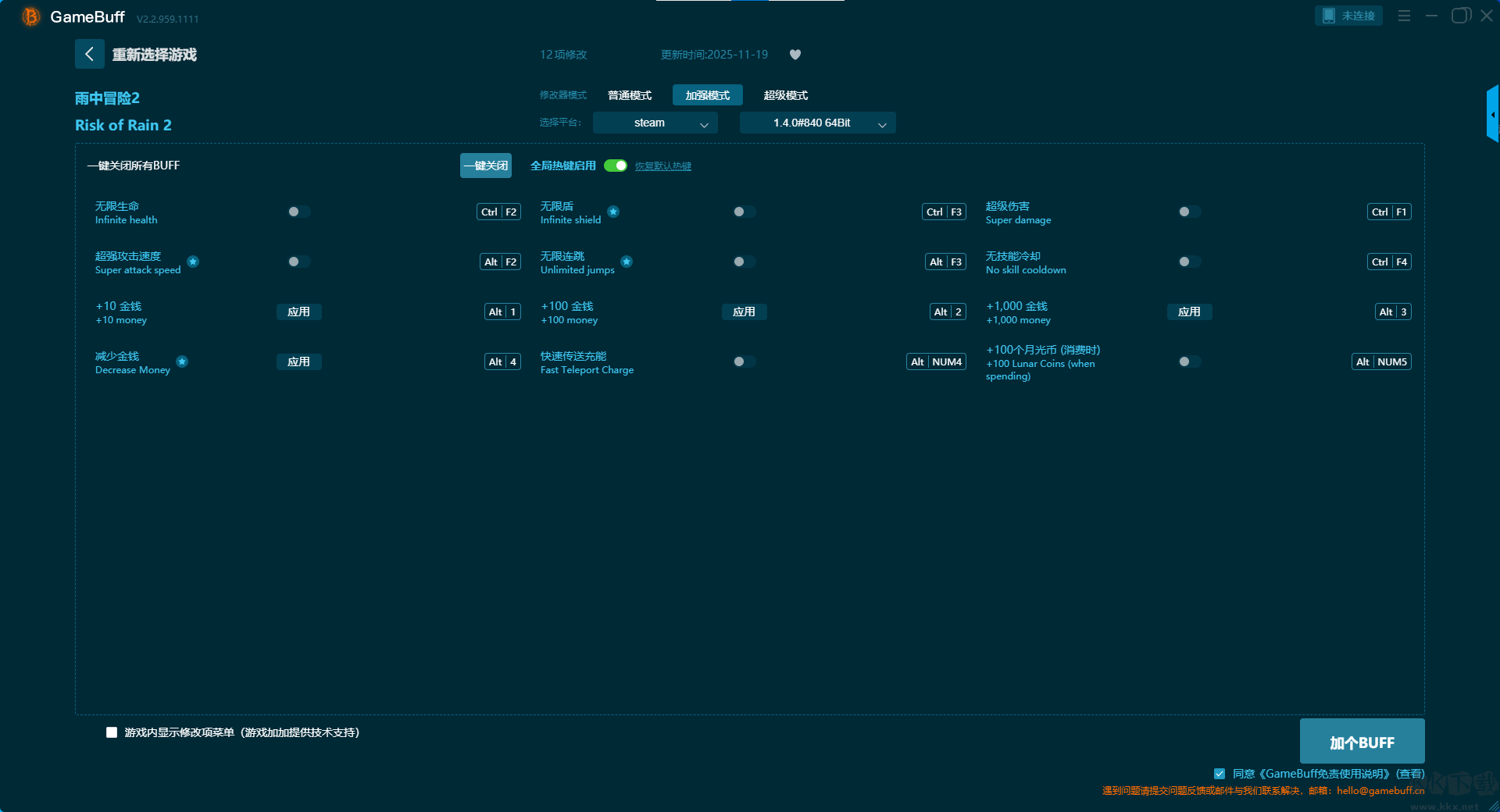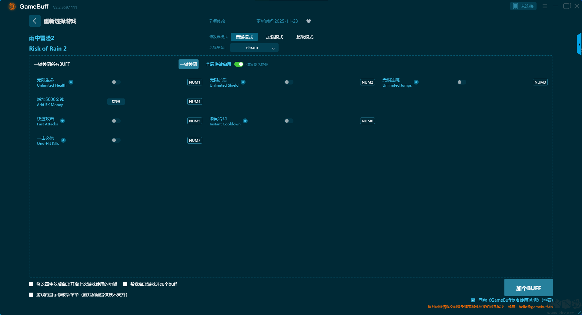 雨中冒险2七项修改器pc官方版是一款功能强大的游戏辅助工具。玩家可在这款修改器中为超多样的游戏进行辅助修改,在游戏的游玩过程中一键开启。在游戏雨中冒险2中拥有,无限生命、无限护盾、一击必杀、快速攻击、无限连跳、瞬间冷却、增加 5000 金钱等多项普通模式修改功能。快来下载体验一下吧。