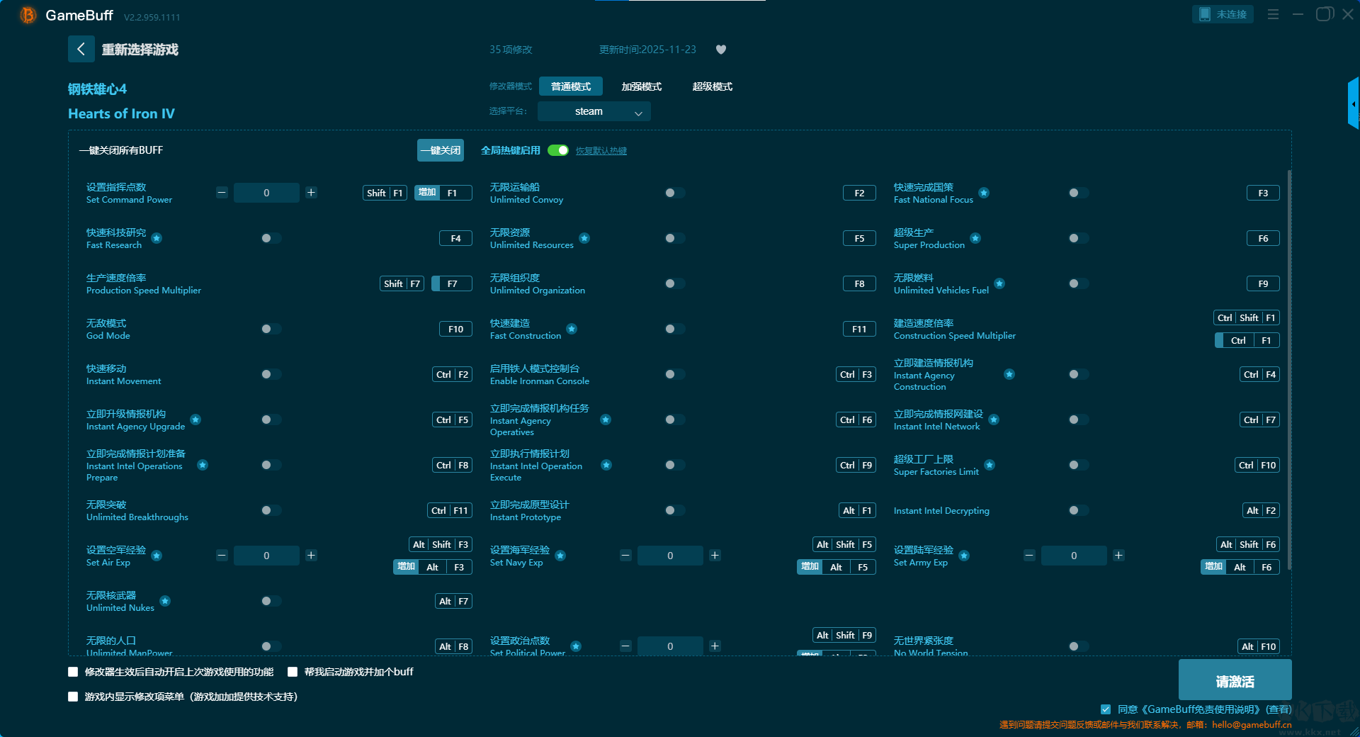 钢铁雄心4三十五项修改器pc中文版普通模式部分修改功能介绍