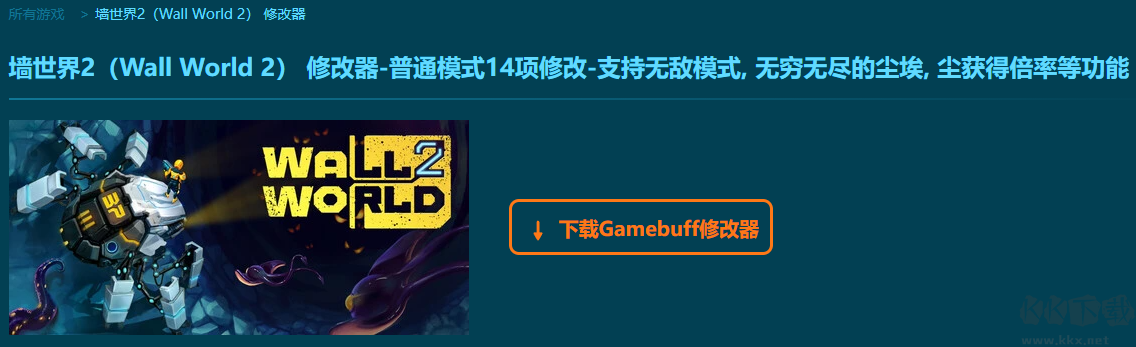 墙世界2十四项修改器pc中文版是一款专业强大的游戏辅助工具。玩家在这款游戏的游玩过程中可一键开启,无敌模式、无穷无尽的尘埃、尘获得倍率、资源获得倍率、力量训练倍率、无视升级成本、无视商店费用、没有机枪冷却时间等多项修改功能。快来KK下载站下载这款修改器体验吧。