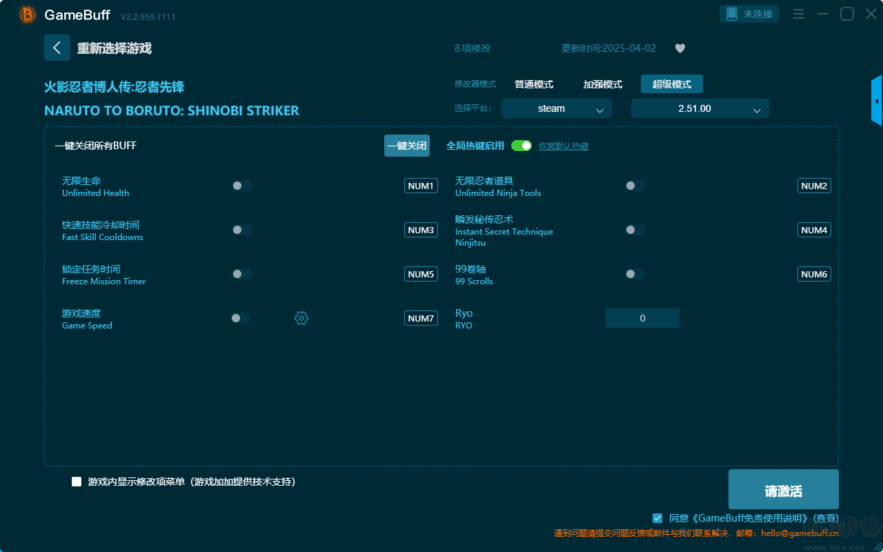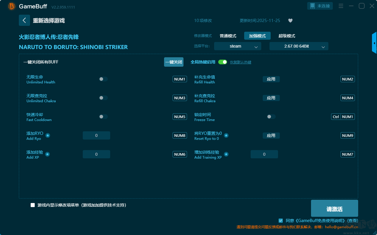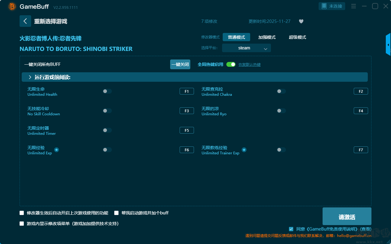 火影忍者博人传忍者先锋七项修改器pc中文版是一款专业使用的游戏辅助工具。玩家可在多种修改功模式中选择一项开启使用,支持在steam平台使用。拥有,无限生命、无限查克拉、快速冷却、添加 RYO、添加经验、锁定时间、增加训练经验、将 RYO 重置为0等多项修改功能。需要的小伙伴快来KK下载站下载修改器体验一下吧。