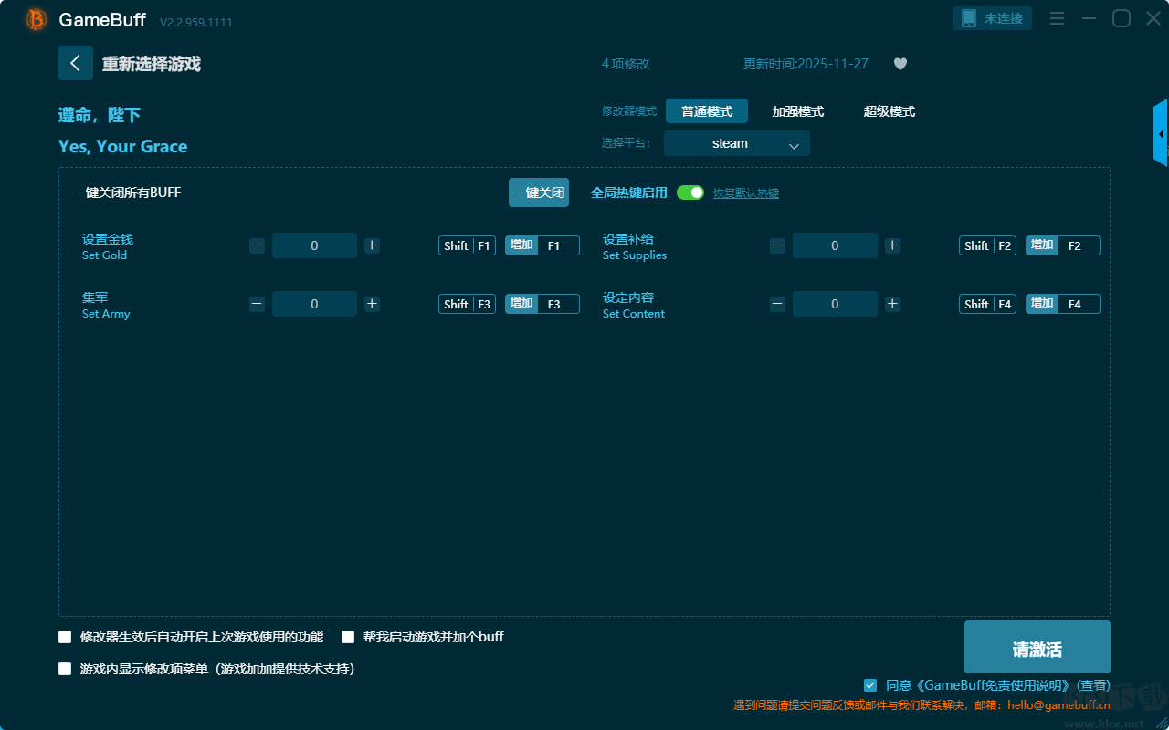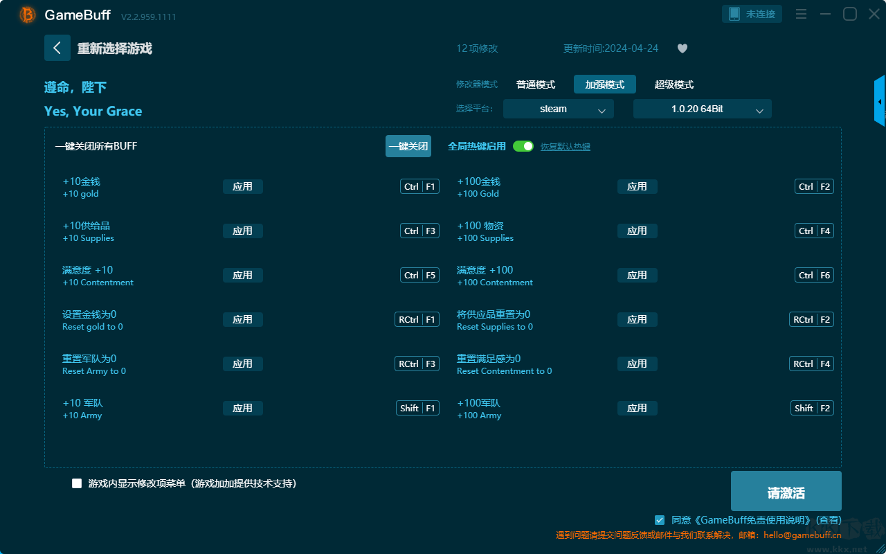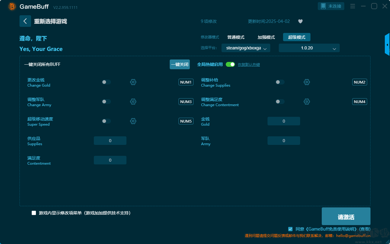 遵命陛下四项修改器pc豪华版是一款功能强大的游戏辅助工具,支持在steam、uwp等平台使用。玩家可在游戏的游玩过程中一键开启,+10金钱、+100金钱、+10供给品、+100物资、满意度+10、满意度+100、设置金钱为0、将供应品重置为0等多项修改功能。需要这款修改器的小伙伴快来KK下载站下载体验一下吧。