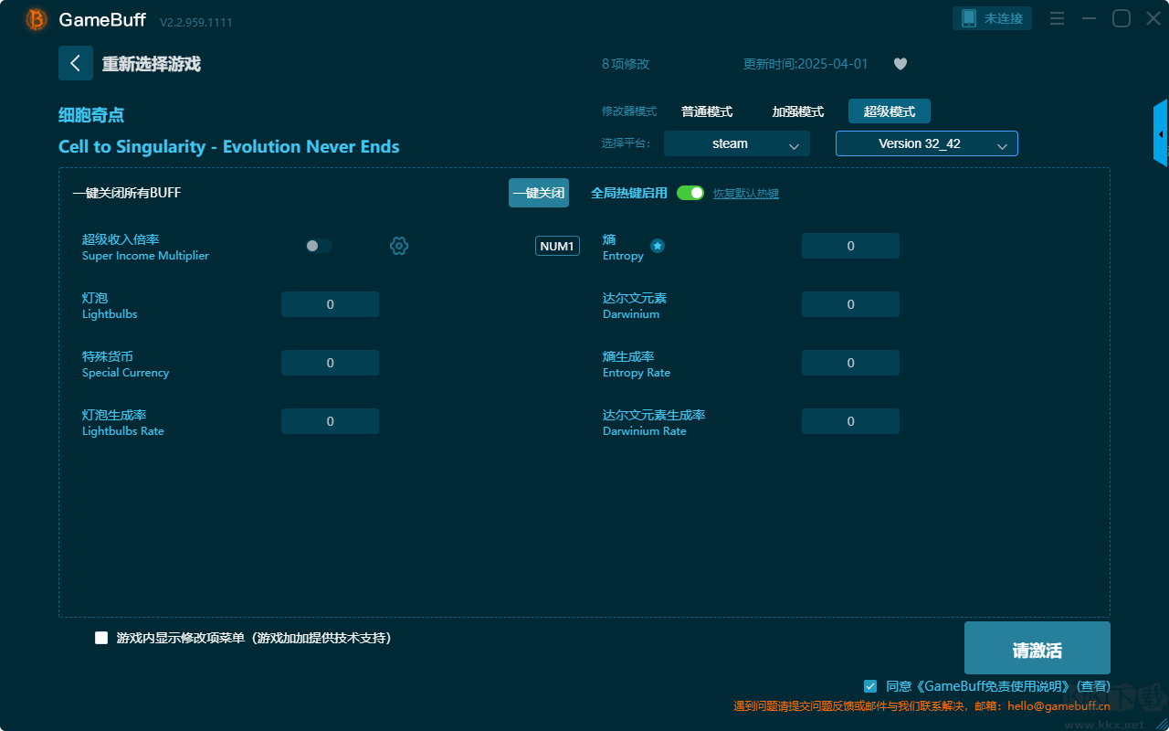细胞奇点三项修改器pc豪华版是一款功能强大的游戏辅助工具。这款修改器支持7000+游戏修改,可自由选择使用。玩家可在细胞奇点的游玩过程中一键开启,增加灯泡、增加化石、增加开关 / 暗物质、增加元胚、添加熵 / 星尘等多项修改功能。快来KK下载站下载体验,开启你的畅爽游玩之旅吧。