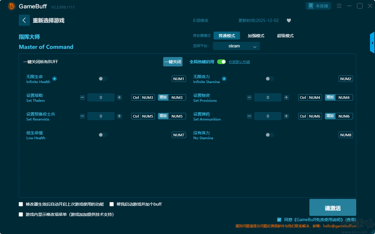 Master of Command八项修改器pc纯绿版是一款功能强大的游戏辅助工具,可在三项修改模式中选择一项开启使用。支持玩家为游戏Master of Command一键开启,无限生命、无限体力、设置塔勒、设置物资、设置预备役士兵、设置弹药、低生命值、没有体力等8项普通模式修改功能。需要的小伙伴快来KK下载站下载体验一下吧。