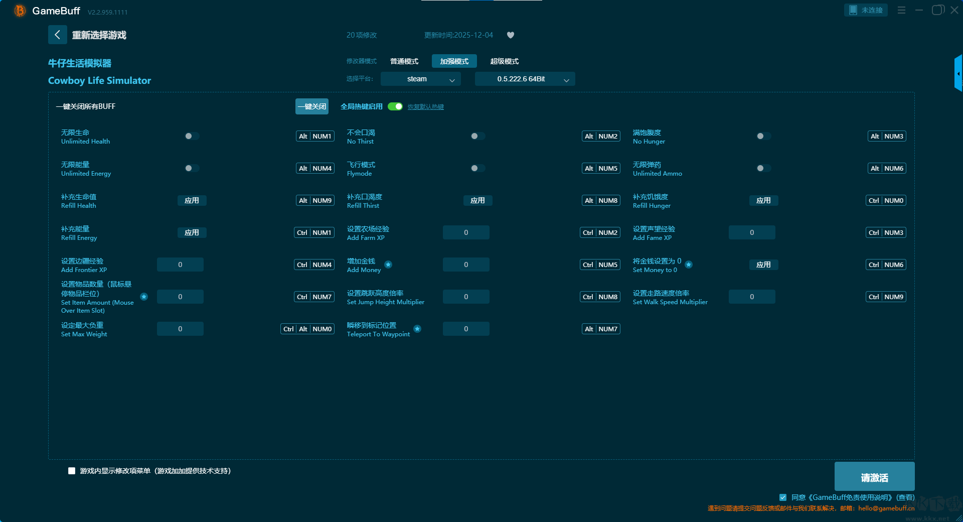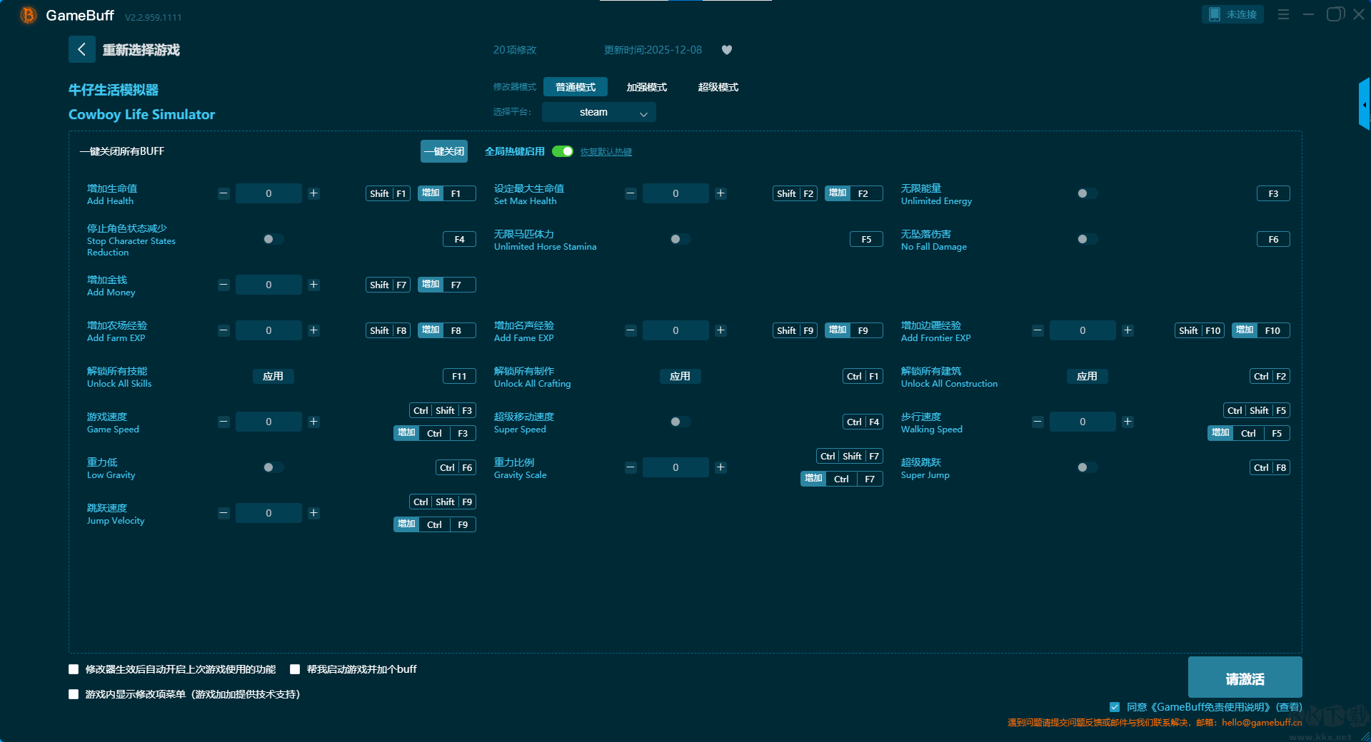 牛仔生活模拟器二十项修改器pc专业版是一款专业且强大的游戏辅助修改工具,可以为游戏牛仔生活模拟器进行超多项修改功能,可一键开启增加生命值、设置最大生命值、无限能量、停止角色状态减少、无限马匹体力、无坠落伤害、增加金钱等修改功能。快来KK下载站下载体验一下这款修改器吧。