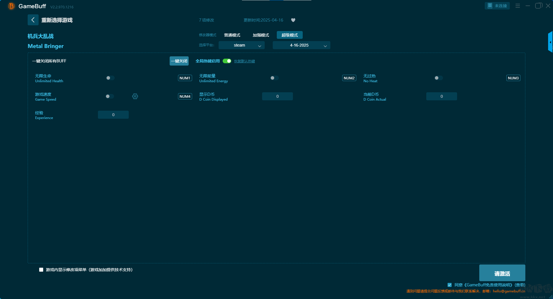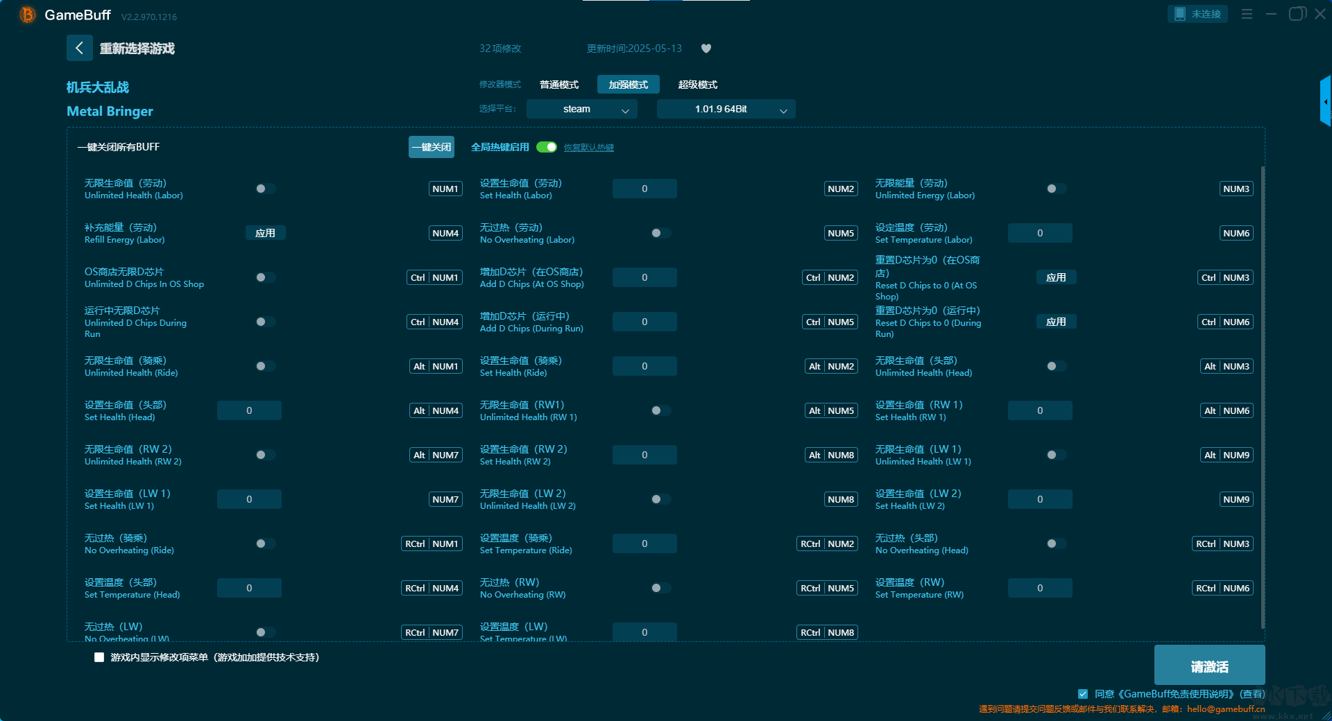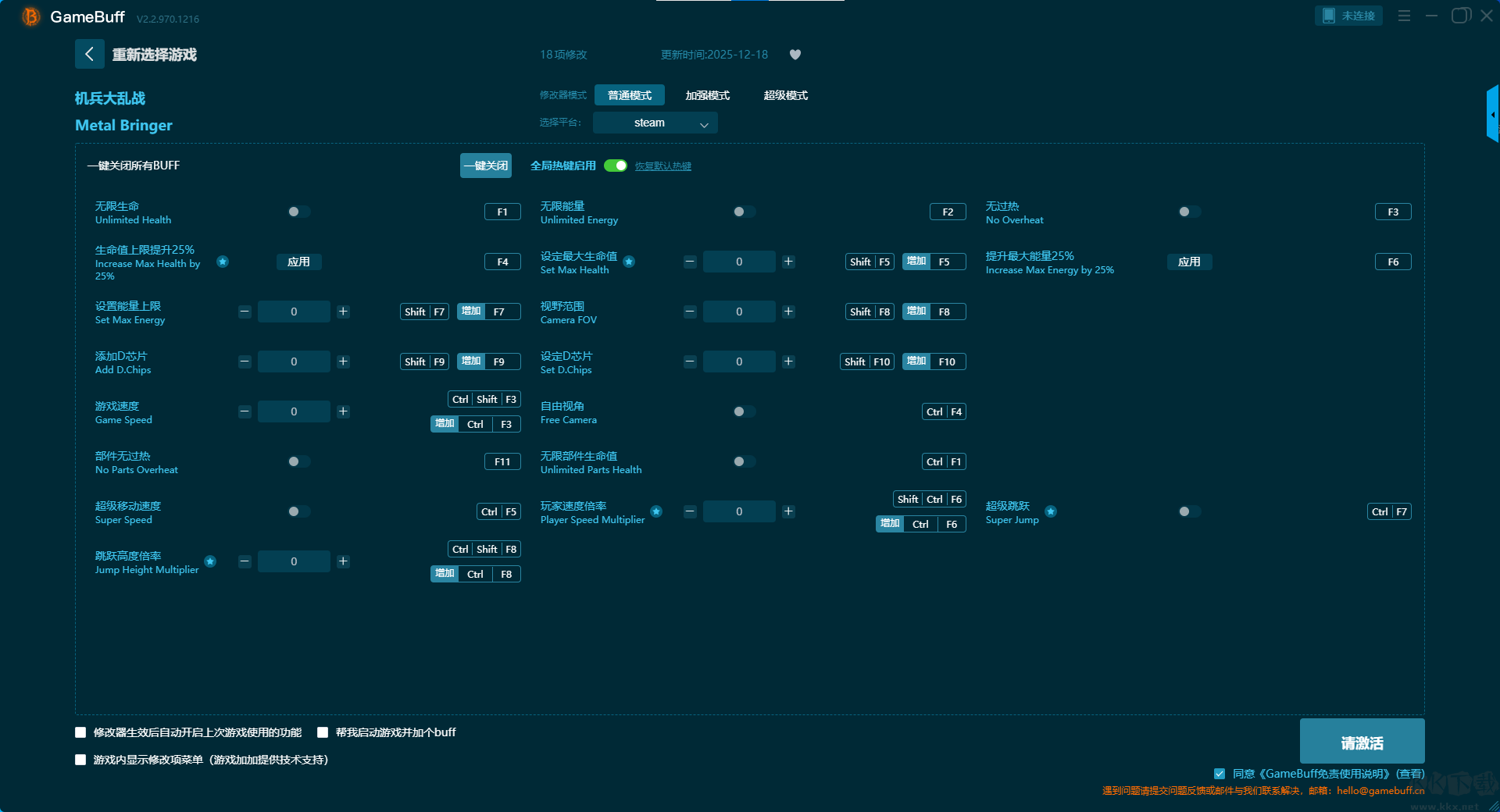 机兵大乱战十八项修改器pc官方版这款修改器能让你安全、自由地修改游戏核心参数,将枯燥的刷刷刷变为畅快的探索,还可以创造出独一无二的极限挑战,让你无限的突破自己。玩家还可在游戏游玩过程中一键开启,无限生命、无限能量、无过热、设置最大生命值、设置能量上限、视野范围、添加 D 芯片、设置 D 芯片等超多修改功能。快来KK下载站下载体验吧。
