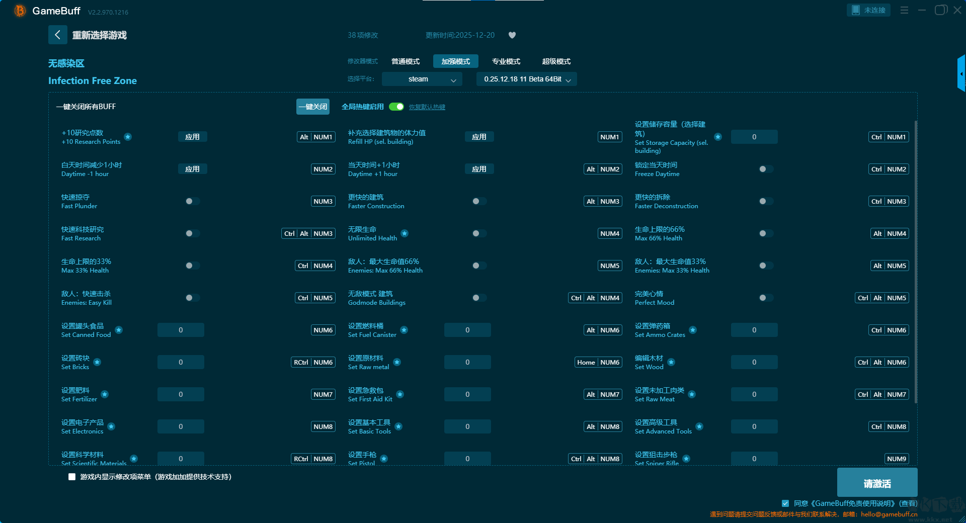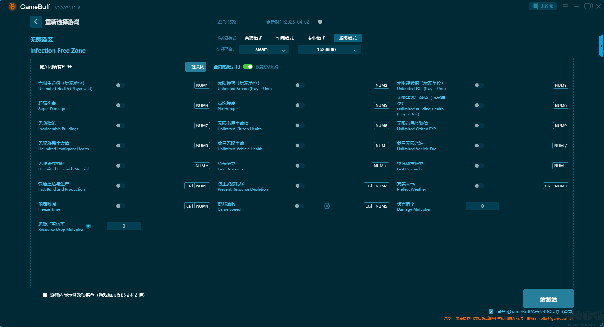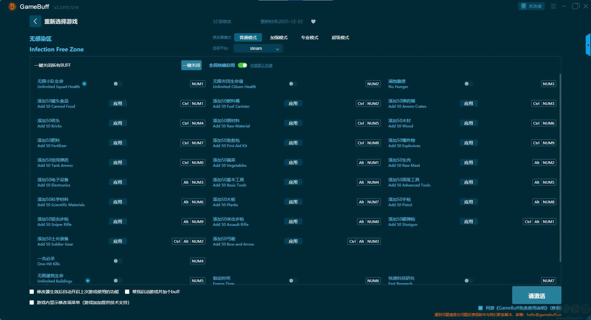 无感染区三十二项修改器pc最新版是一款拥有超多修改功能的强大游戏辅助工具,支持玩家在steam平台使用体验。可在游戏的游玩过程中一键开启,无限小队生命、无城市民生命值、无饥饿度、一击必杀、无限建筑、锁定时间、快速科技研究等超多修改功能。快来KK下载站下载这款修改器体验,开启你的无敌游玩之旅吧。