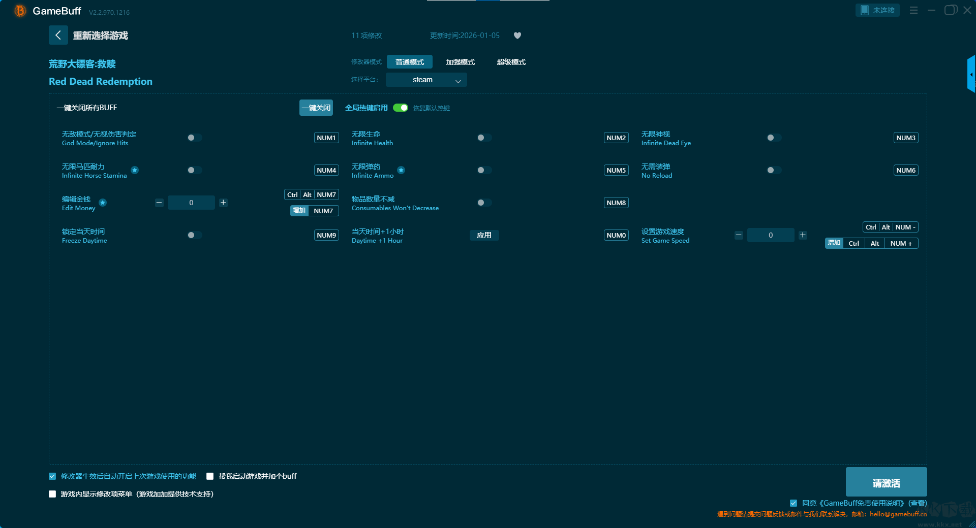 荒野大镖客救赎十一项修改器pc免费版是一款集成了海量资源的多功能游戏修改器聚合平台,将市面上数千款热门单机游戏的修改功能汇聚于一身,让您无需再为寻找、下载、配置一个个独立的修改器而烦恼。你可在这款修改器中为游戏荒野大镖客救赎一键开启,无敌模式 / 无视伤害判定、无限马匹耐力、编辑金钱、锁定当天时间、无限生命、无限弹药、物品数量不减、设置游戏速度等修改功能。需要的小伙伴快来KK下载站下载体验吧。