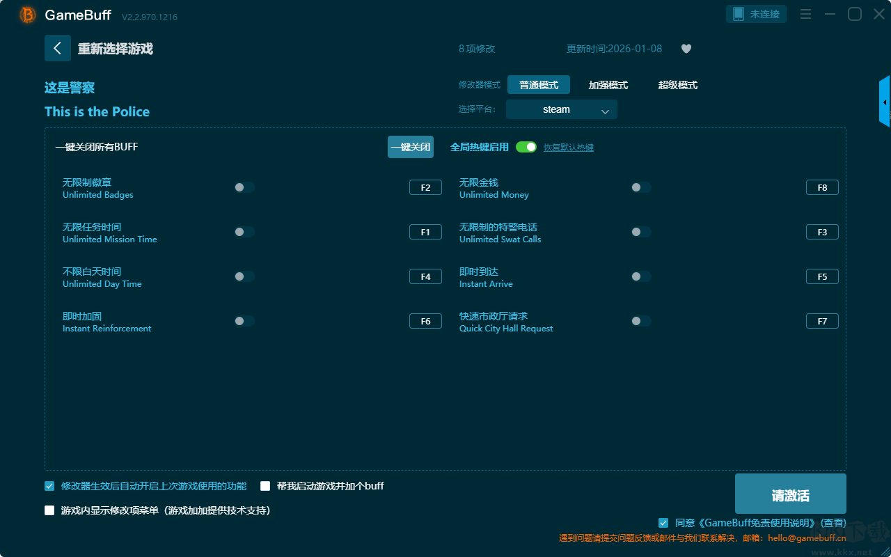 这是警察八项修改器pc完整版是一款集成了海量热门游戏的修改脚本,为玩家提供更自由、更轻松的游戏体验的强力游戏修改工具。玩家可在这款修改器中为游戏这是警察开启,无限制徽章、无限任务时间、不限白天时间、即时加固、无限金钱、无限制的特警电话、即时到达、快速市政厅请求等多样修改功能。快来KK下载站下载使用吧。