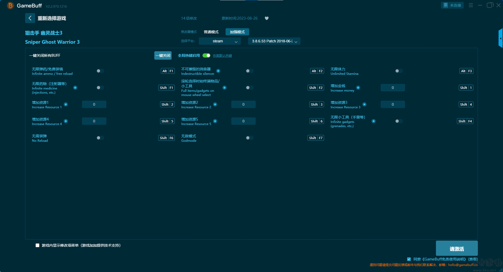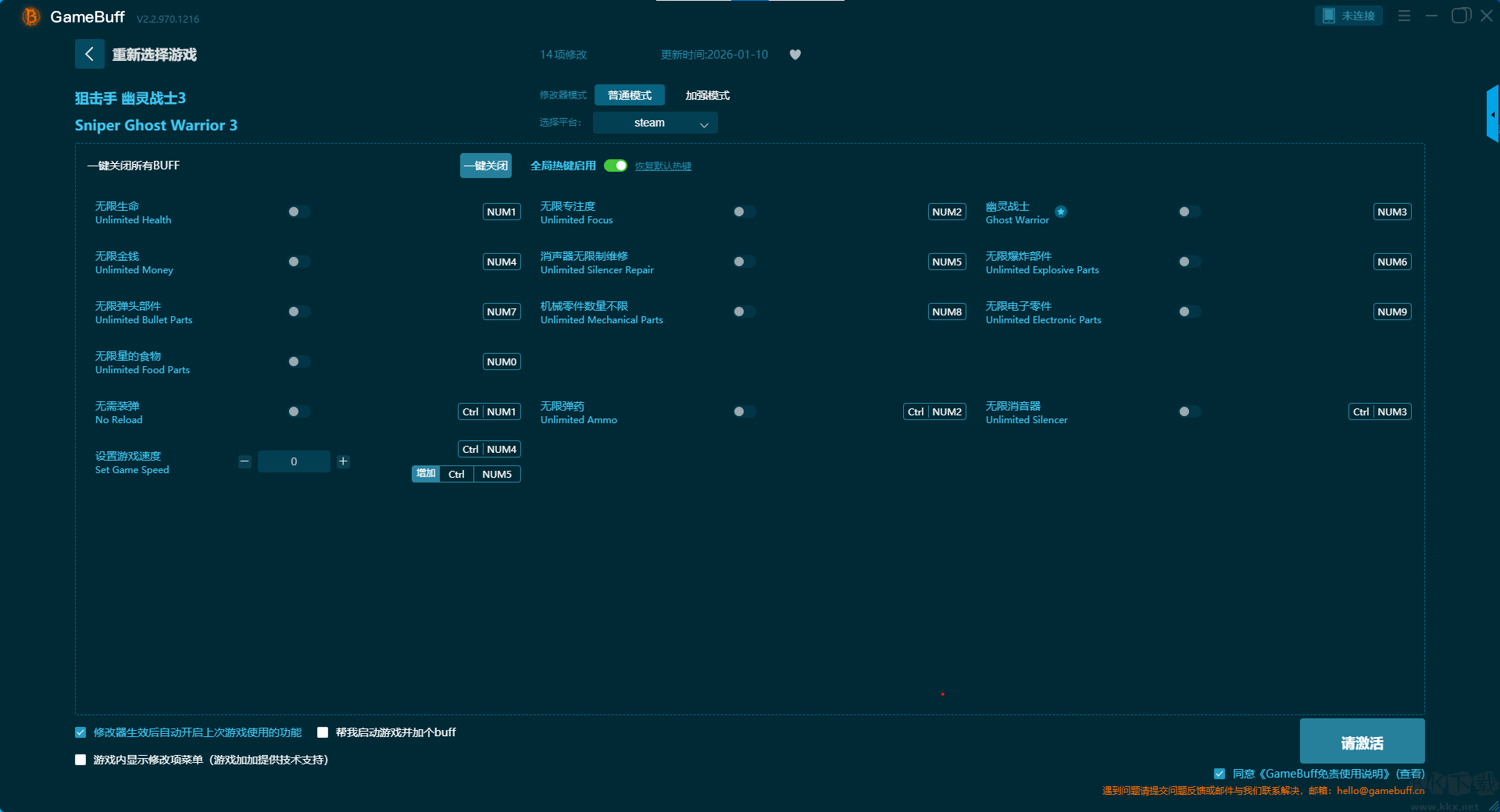 狙击手幽灵战士3十四项修改器pc正式版是一款专为单机游戏玩家设计的全能型游戏辅助工具。你可在这款修改器中为游戏狙击手幽灵战士3一键开启,无限生命、无限专注力、幽灵战士、无限金钱、消声器无限制维修、无限爆炸部件、无限弹头部件、机械零件数量不限、无限电子零件等超多功能。喜欢这款修改器旧快来KK下载站下载体验吧。