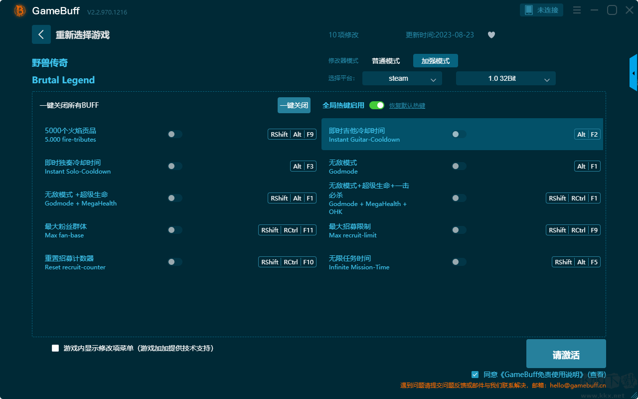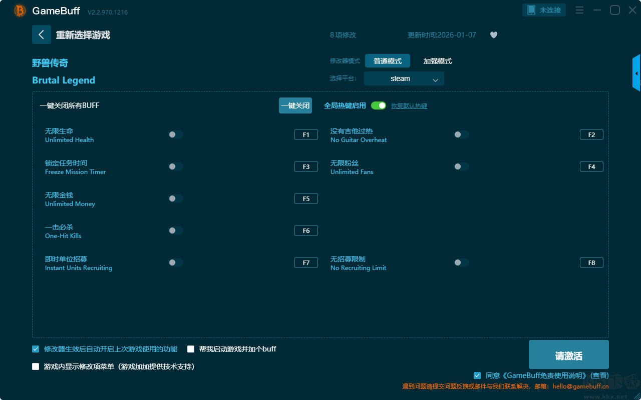 野兽传奇八项修改器pc国际版是一款专为PC单机游戏设计的多功能辅助工具,致力于为玩家提供更自由、更便捷的游戏体验。你可以为游戏野兽传奇一键开启,无限生命、锁定任务时间、无限金钱、一击必杀、即时单位招募、没有吉他过热、无限粉丝、无招募限制等超多修改功能。需要的小后半快来KK下载站下载体验吧。