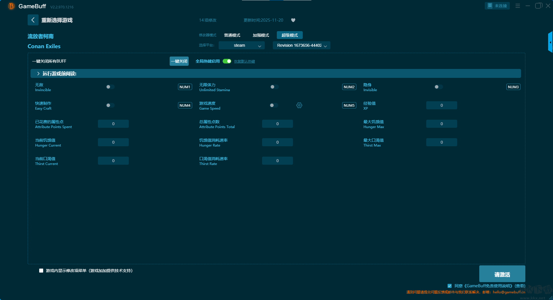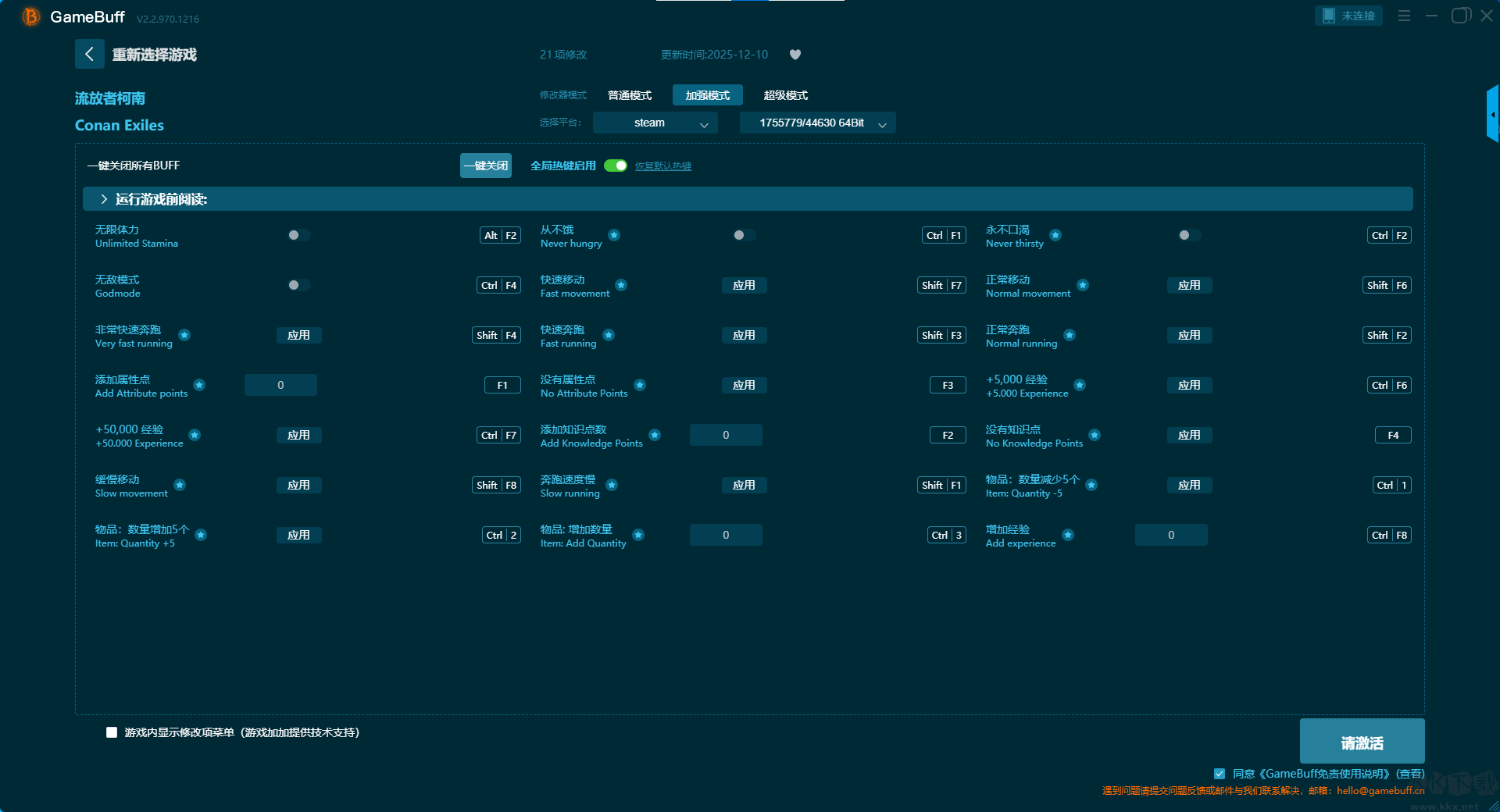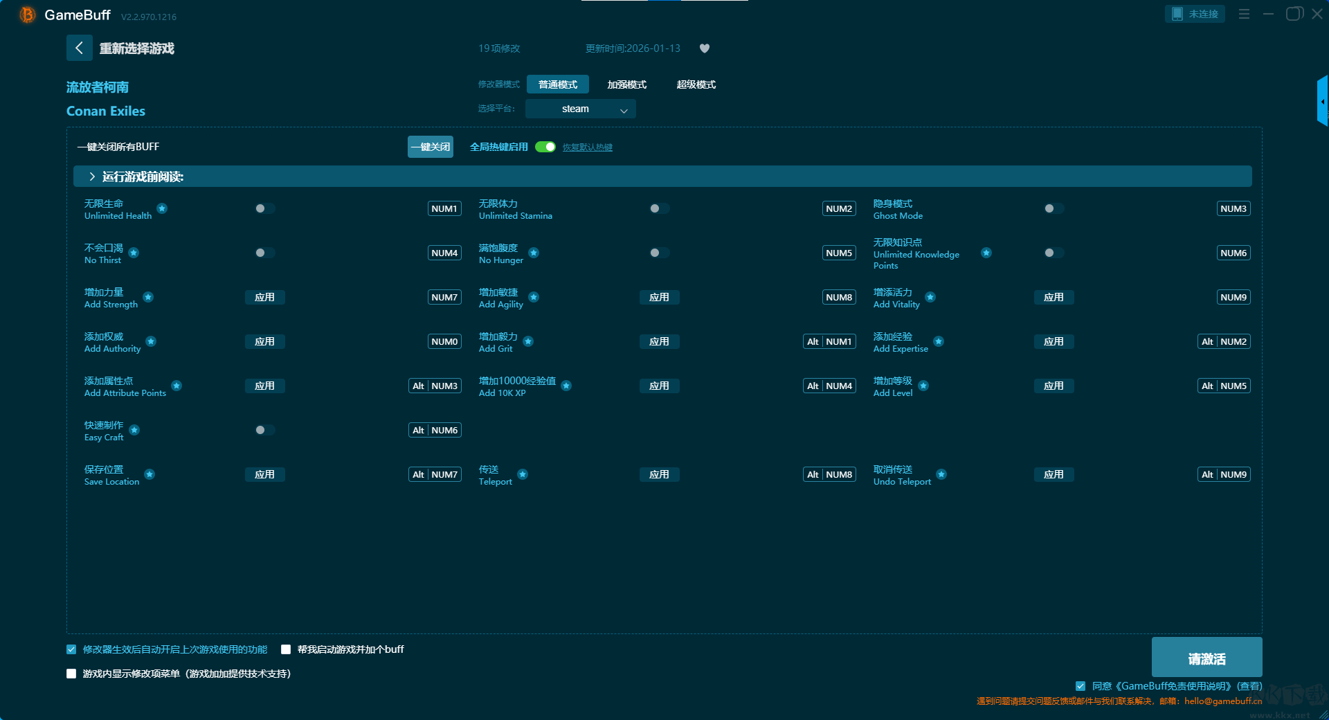 流放者柯南十九项修改器pc汉化版是一款专为PC单机游戏玩家设计的轻量级、多功能游戏数据修改工具。你可在这款修改器中为游戏流放者柯南一键开启,无限生命、不会口渴、增加力量、添加权威、添加属性点、快速制作、保存位置、无限体力等超多修改功能。喜欢的小伙伴快来KK下载站下载体验一下吧。