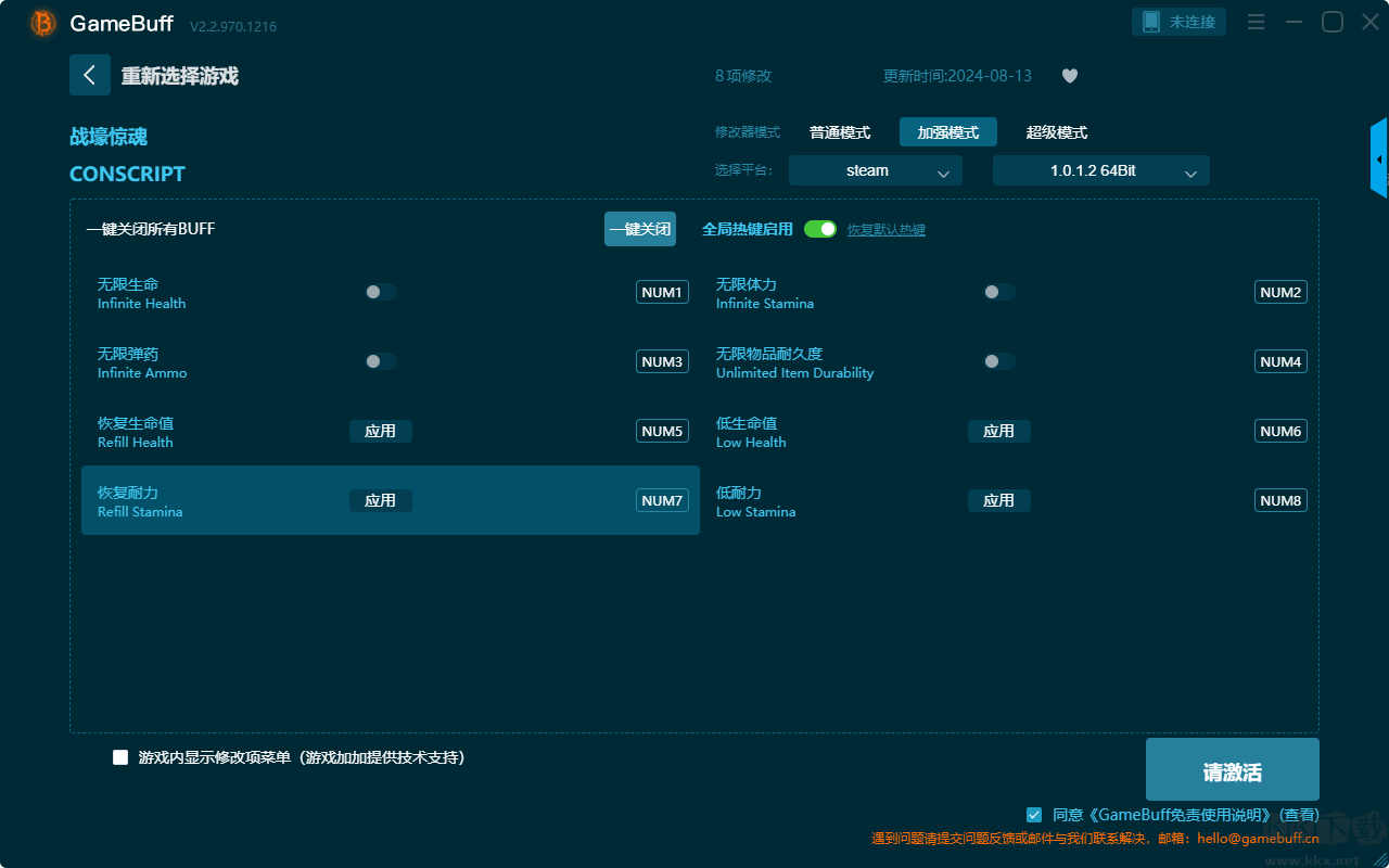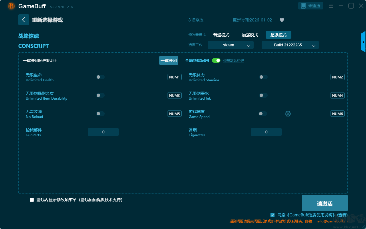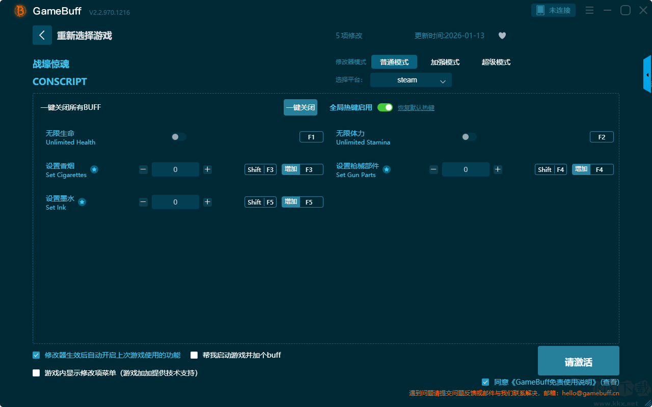 战壕惊魂五项修改器pc正版是一款集成了智能识别、海量脚本与深度定制功能的综合性游戏辅助平台。支持在steam平台为游戏战壕惊魂一键开启,无限生命、无限体力、设置香烟、设置枪械部件、设置墨水、无需装弹、游戏速度、枪械部件、香烟等超多修改功能。需要这款修改器的小伙伴快来KK下载站下载体验一下吧。