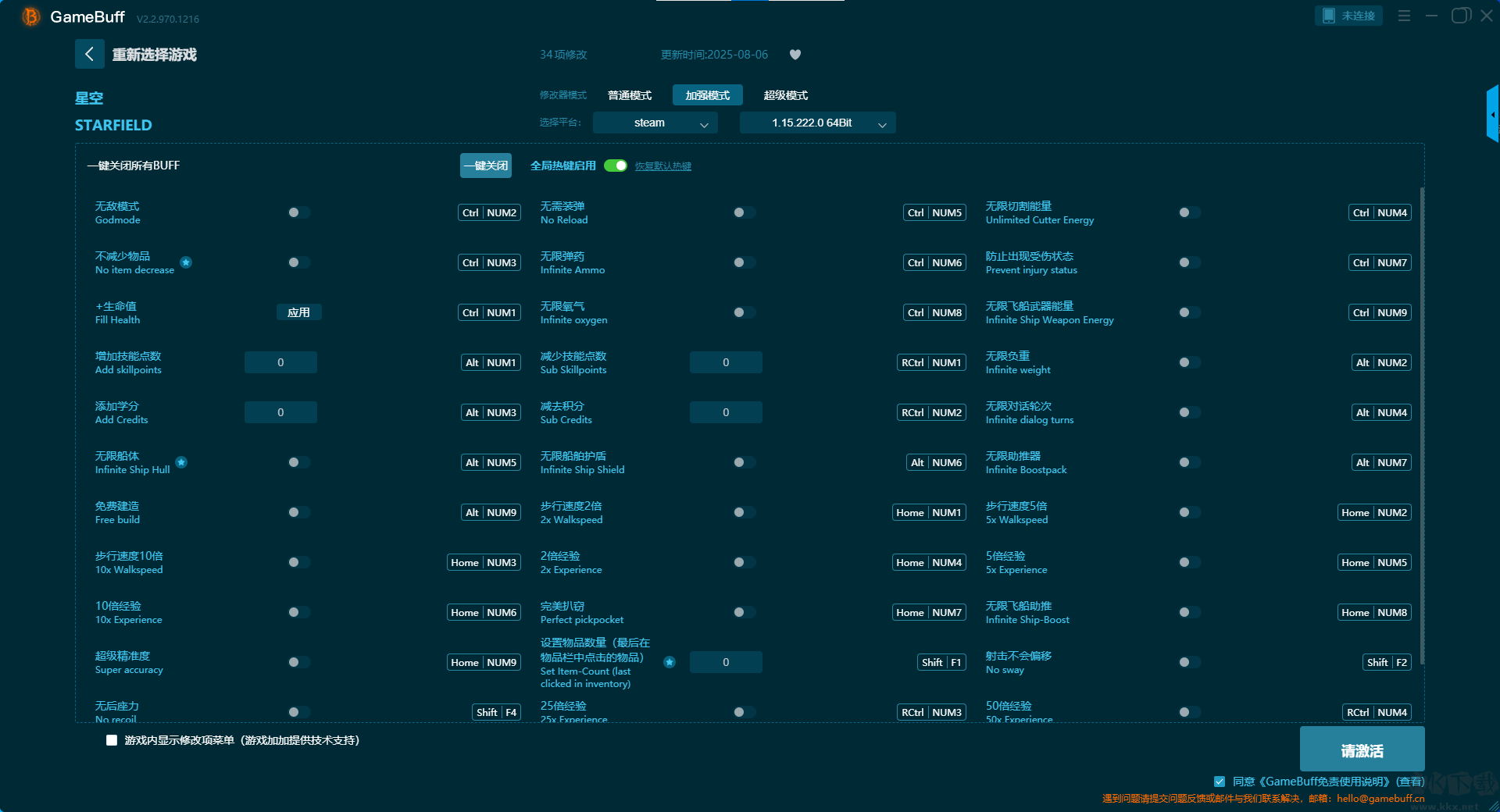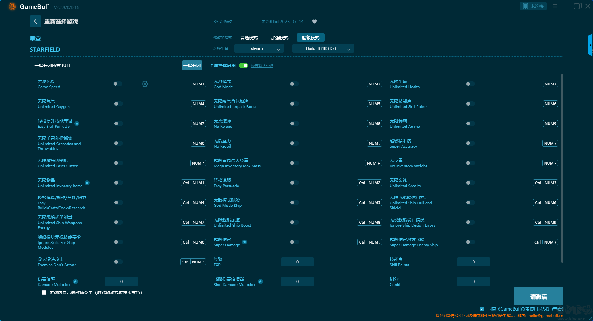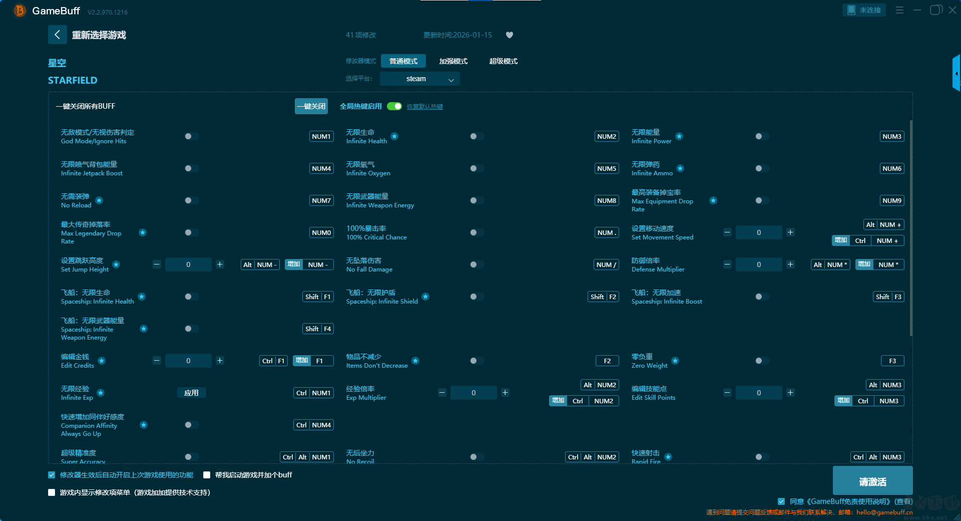 星空四十一项修改器pc最新版是一款致力于为热衷于单机及局域网游戏的玩家,提供一个安全、高效且充满创造力的交互环境,让每一次启动游戏都充满全新的期待。你可在游戏星空中一键开启,无敌模式 / 无视伤害判定、无限生命值、无限能量、无限喷气背包能量、无限氧气、无限弹药、无需装弹、无限武器能量、最高装备掉率等超多修改功能。快来KK下载站下载体验吧。