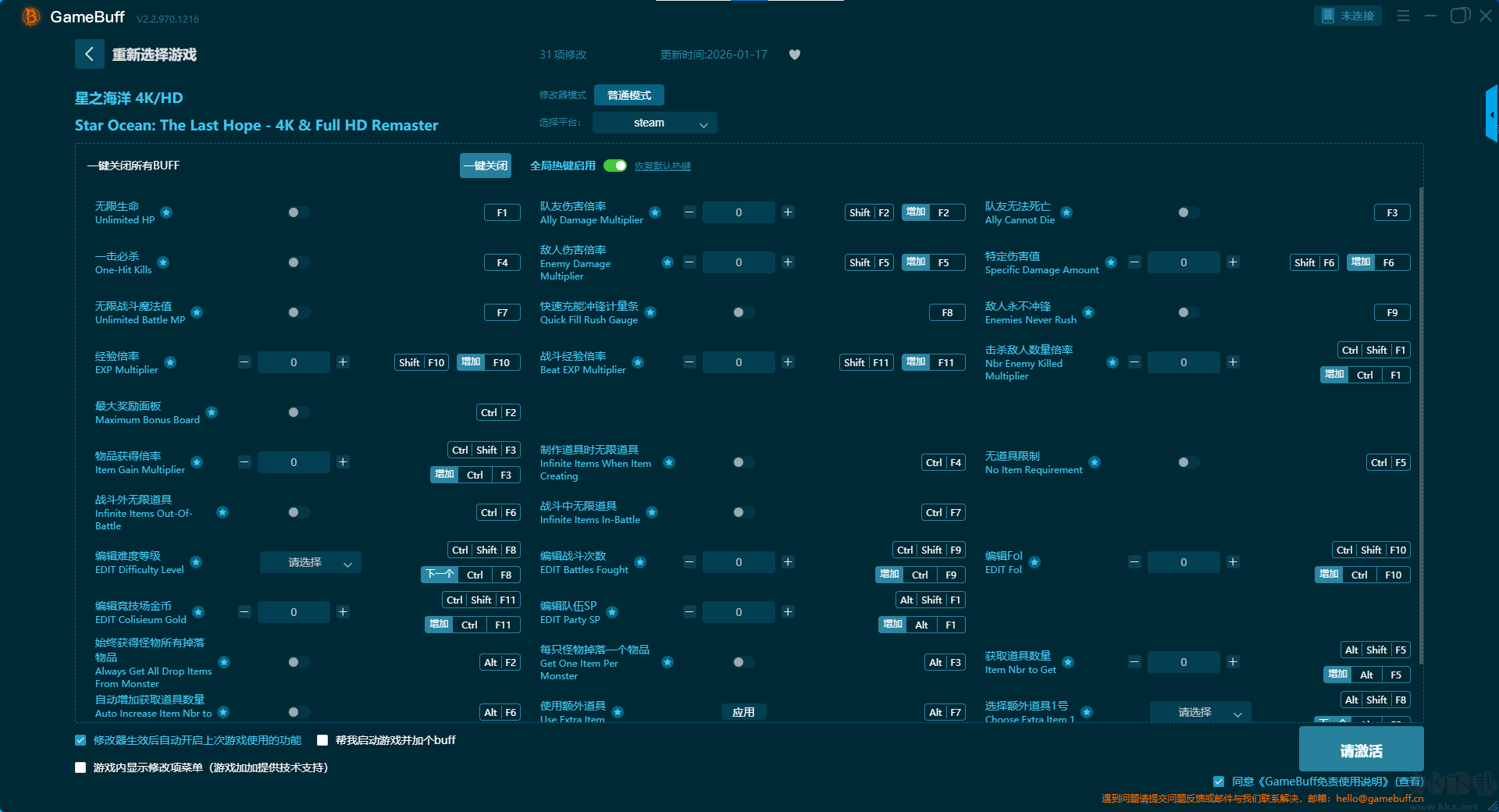 星之海洋4K/HD三十一项修改器pc完整版是一款简单的作弊工具,更是一个集成了海量游戏脚本、具备智能管理功能的综合性辅助平台。你可以为这款游戏一键开启,无限生命、一击必杀、无限战斗魔法值、经验倍率、最大奖励面板、物品获得倍率、战斗外无限道具、编辑难度等级等超多修改功能。需要的小伙伴快来KK下载站下载体验一下吧。