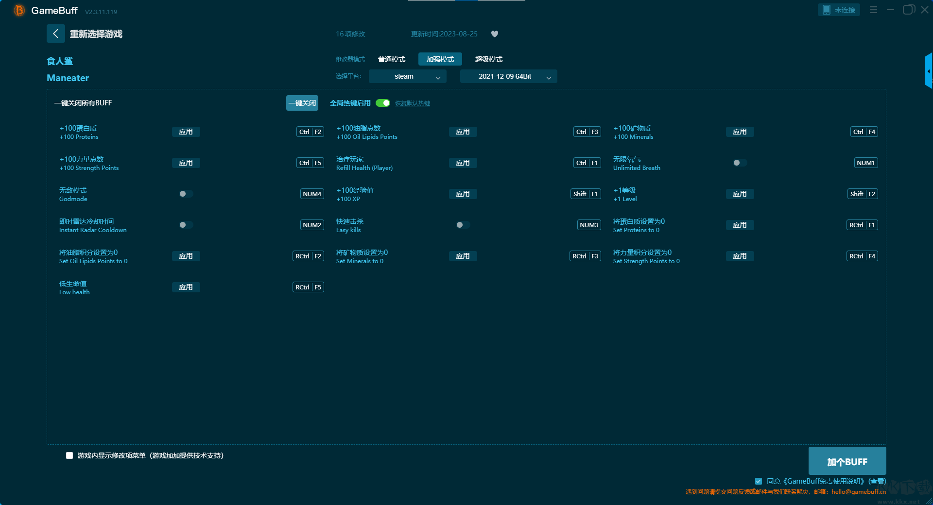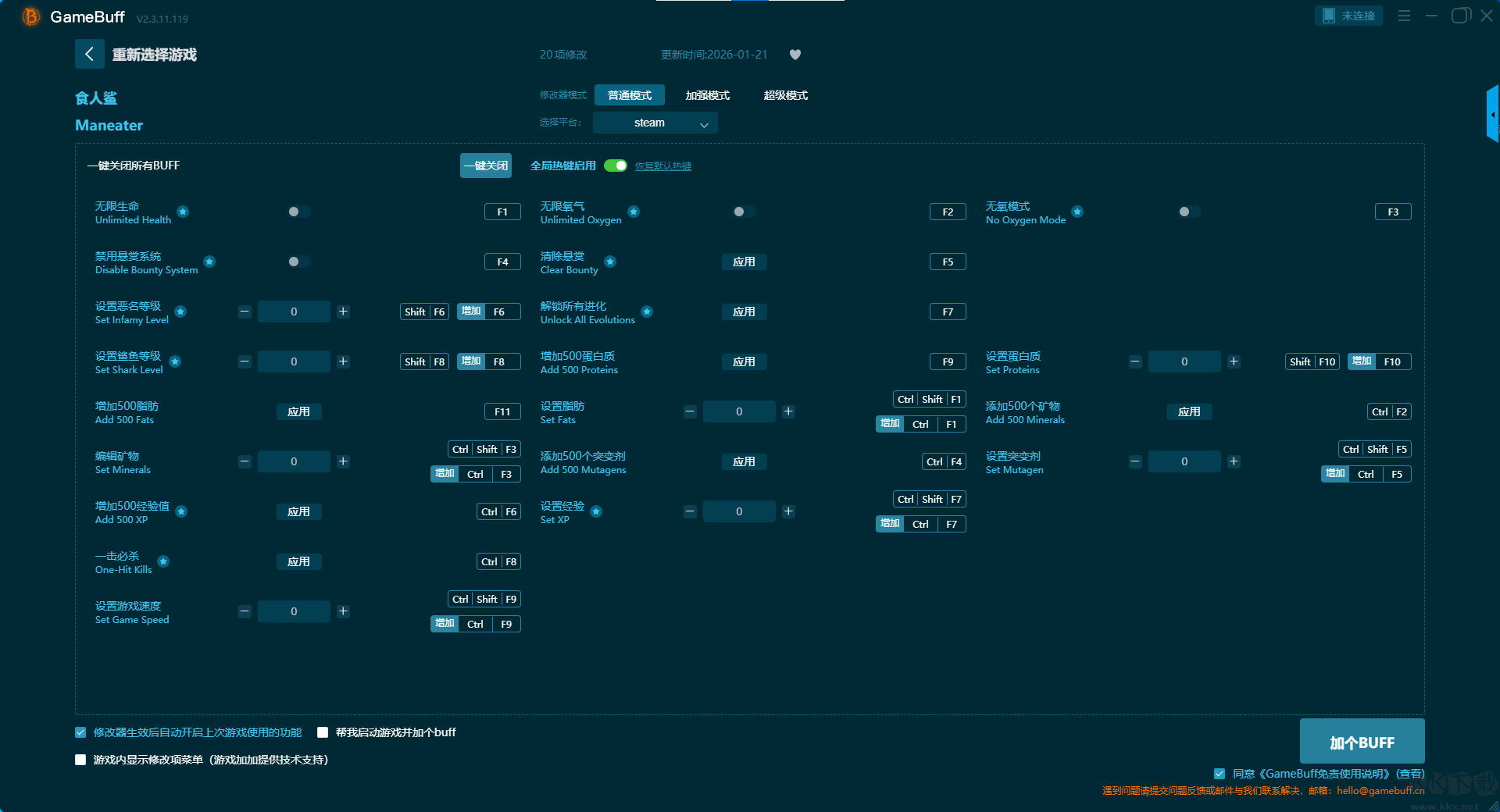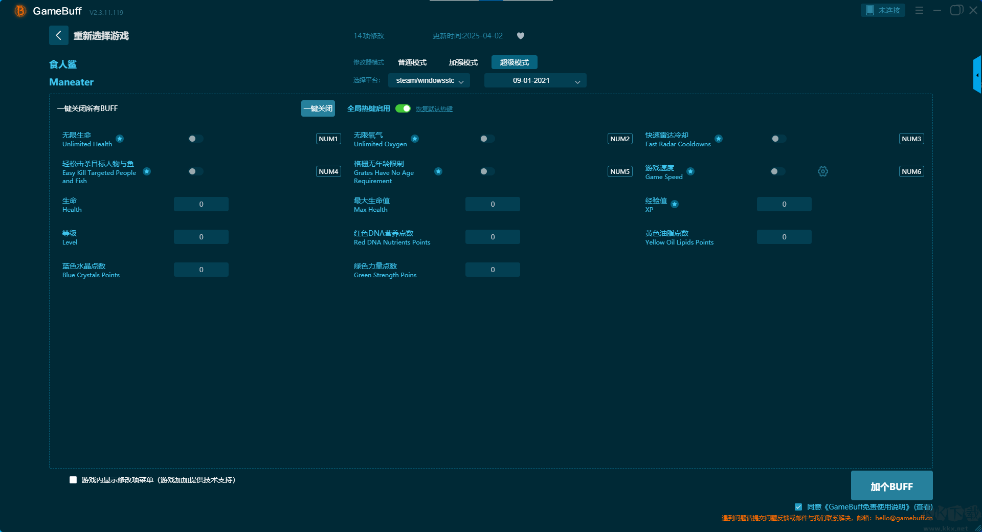 食人鲨二十项修改器pc最新版是一款专为PC及移动端游戏玩家设计的辅助工具,提升游戏体验的灵活性与自由度。你可以为游戏食人鲨一键开启,无限生命、禁用悬赏系统、设置恶名等级、设置鲨鱼等级、增加 500 脂肪、编辑矿物、增加 500 经验值、一击必杀、设置游戏速度、无限氧气等超多项修改功能。快来KK下载站下载体验版。