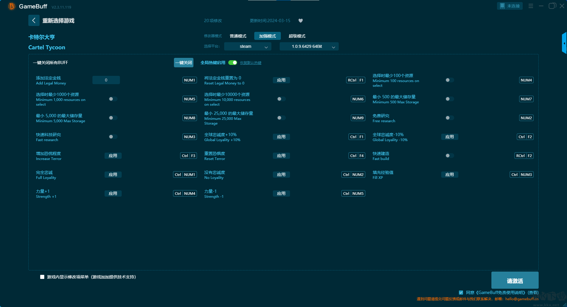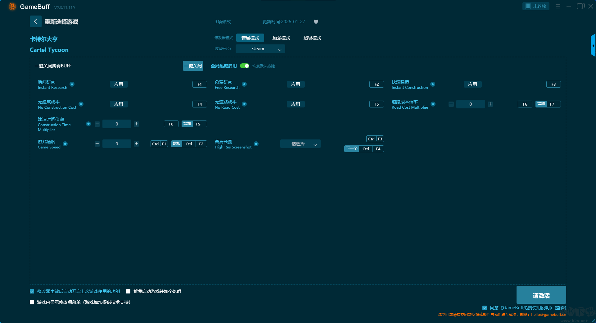 卡特尔大亨九项修改器pc最终版是一款专为游戏爱好者打造的系统级内存修改工具。通过深度优化游戏参数,为玩家解锁更自由、更具探索性的游戏体验。还支持为游戏卡特尔大亨一键开启,瞬间研究、免费研究、快速建造、无建筑成本、无道路成本、道路成本倍率、建造时间倍率等超多修改功能。喜欢这款修改器的小伙伴快来KK下载站下载吧。