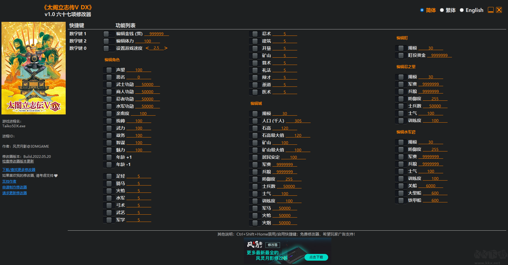 针对最新推出的太阁立志传V DX版本新鲜出炉的太阁立志传V DX六十七项修改器由风灵月影制作,提供了超多的修改功能,一共有67项,相信完全可以满足大家在游戏中的修改要求。可以任意编辑角色属性,编辑城池属性、编辑町属性、编辑军队属性等等,正好在玩这款游戏的玩家不要错过!