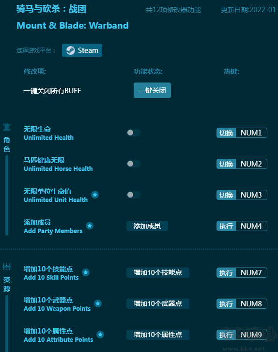 骑马与砍杀战团修改器是专为《骑马与砍杀战团》开发的游戏修改器。内置无限生命,马匹健康,无限单位生命值,增加10技能点等十二项强力修改功能,一定能让你游戏更畅快!感兴趣的朋友不要错过,KK下载站推荐大家下载体验!