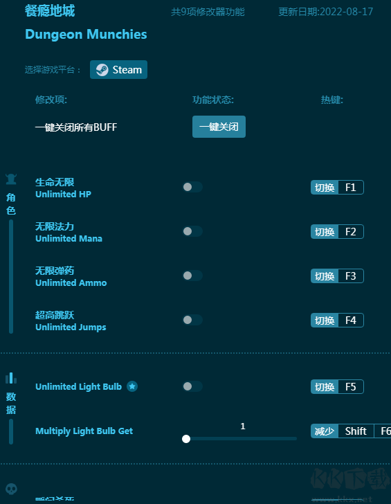 餐瘾地城修改器能够为《餐瘾地城》玩家提供九项强力修改功能,游戏中玩家需要击败敌人并吃掉获取能力。有了这款修改器,提供无限生命,无限法力,无限弹药,超级跳跃等功能,让你能够轻松击败所有敌人!感兴趣的朋友不要错过,KK下载站推荐大家下载体验!
