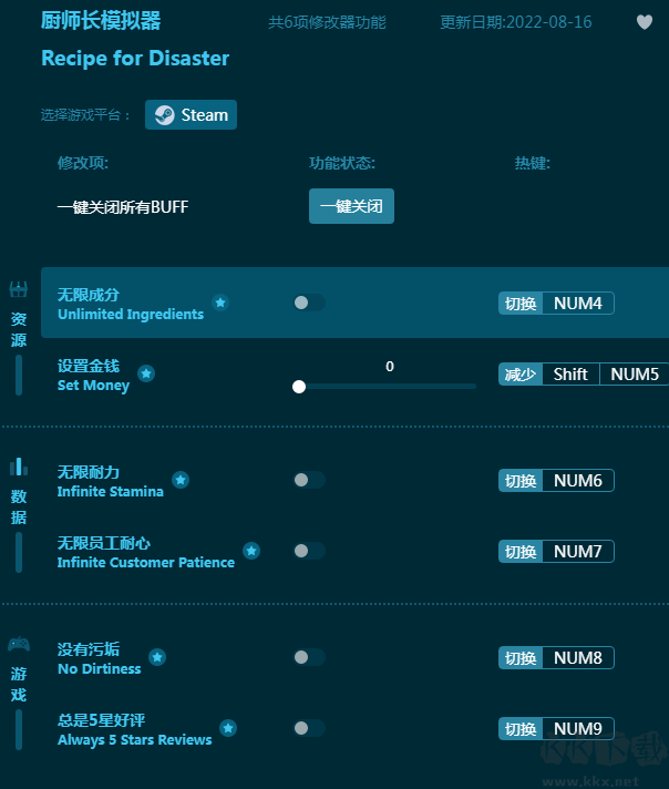 厨师长模拟器修改器为玩家带来六项游戏辅助功能,帮助玩家管理后厨,让餐厅更加火爆。辅助功能包括无限成分,无限耐力,无限员工耐心,没有污垢等等,轻松变身五星级厨房!感兴趣的朋友不要错过,KK下载站推荐大家下载体验!