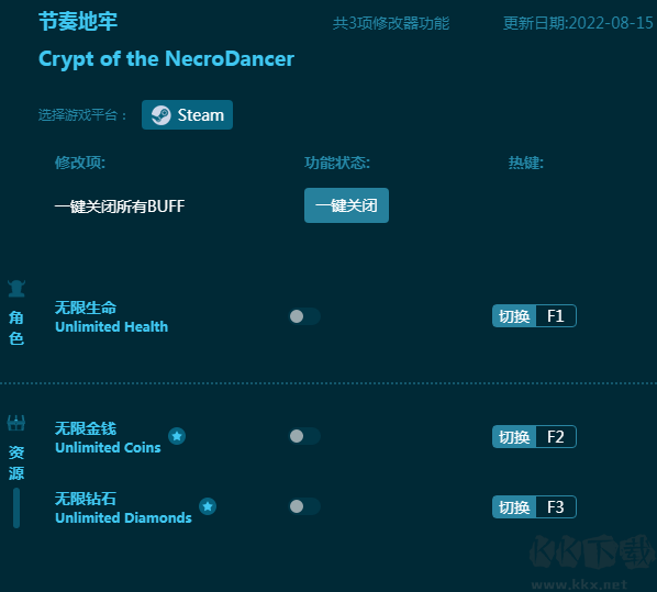 节奏地牢修改器专为《节奏地牢》玩家开发,内置强力三项修改功能,为玩家提供无限资源,无限生命。有了这两样功能,游戏通关轻轻松松!感兴趣的朋友不要错过,KK下载站推荐大家下载体验!