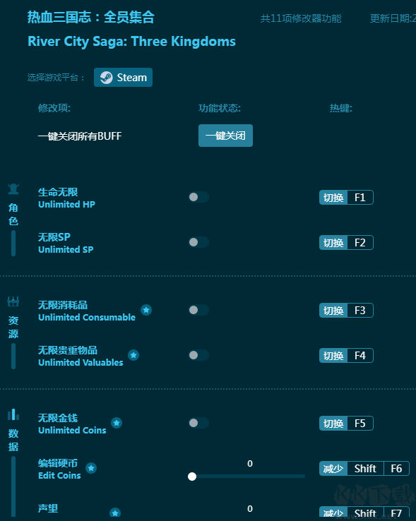 热血三国志全员集合修改器是一款《热血三国志全员集合》的专用修改辅助工具,支持十一项全能辅助功能,无限生命,无限sp,无限消耗品,无限金钱等等。可一键开启关闭,让玩家轻松通过!有需要的朋友不要错过,KK下载站推荐大家下载体验!