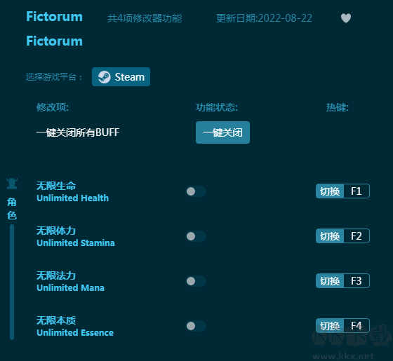 Fictorum修改器是一款中文辅助工具,简单好用,进入游戏即可一键开启。软件提供四项辅助功能,包括无限生命,无限体力,无限法力,无限本质等,为玩家提供更爽快的游戏体验!有需要的朋友不要错过,KK下载站推荐大家下载体验!