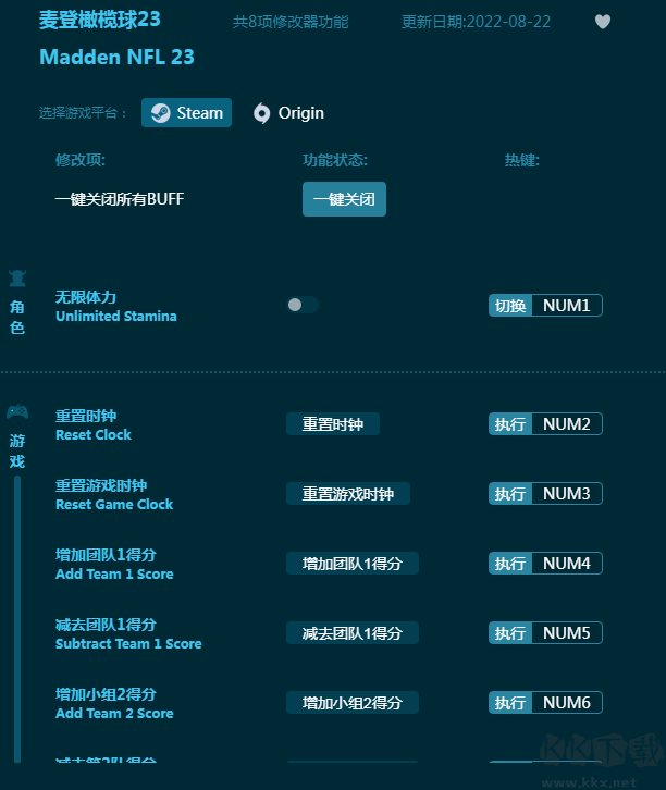 麦登橄榄球23修改器为全新出品的游戏《麦登橄榄球23》开发,内置八项游戏辅助功能,玩家自由开启关闭,使用简单。无限体力,增加得分,重置时间等功能,一定能让玩家赢到最后!有需要的朋友不要错过,KK下载站推荐大家下载体验!
